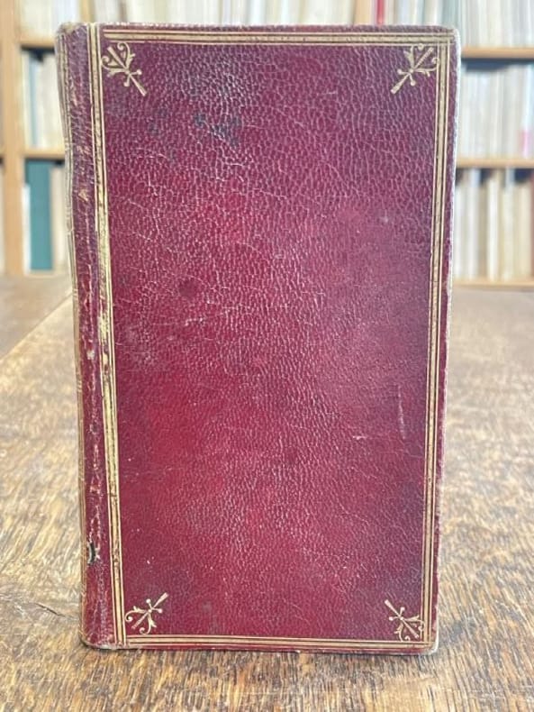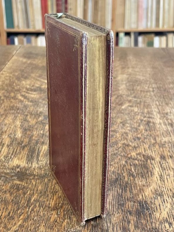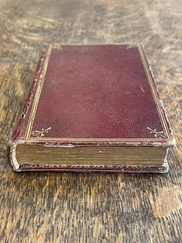 1787 reliure plein veau havane marbré in-douze (binding full calfskin duodecimo), dos long (spine without raised band) - compartiments à fleuron au fer évidé et petits fers en remplissage (compartment with - floweret with hollowed out blocking stamp - with small blockings stamps in filling) - pièce de titre sur fond grenat (garnet label of title), coiffe supérieure légèrement défraîchie (head of the spine lightly faded), filet sur les coupes (gilt line on the cuts) - manque de dorure (blurred gilding), toutes tranches rouges (all red edges), pages de garde peignées à motif "coquille sur fond caillouté" (painting endpapers) - manque la page de garde du deuxième plat (it misses endpaper of the second cover), page de faux-titre (half title page), illustrations : page de titre ornée d'une petite illustration en cul-de-lampe et orné de bandeaux et de culs-de-lampe (title page with a small illustration in tailpiece and illuminated of headpieces and tailpieces), naissances de rousseurs (beginning of the redness marks) - sans piqûre ni mouillure (without small point of redness mark - without scar of waterstain), II + pages du calendrier non paginées et 314 pages avec Approbation & Privilège du Roi, 1787 à Paris Chez l'Auteur rue des Nonaindières,