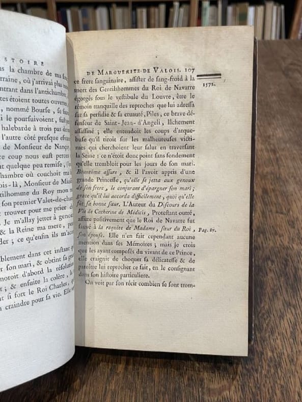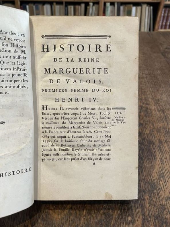 Edition originale. ''C'est avec raison qu'on est étonné de voir qu'entre tant d'auteurs qui ont écrit sur la vie particulière des Princes, aucun n'ait entrepris celle de la Reine Marguerite de Valois.'' Brunet VI, Manuel du libraire et de l'amateur de livres, 23649 - Quérard VI, La France littéraire, p. 204 - Cioranescu II, Bibliographie de la littérature française du XVIIIème, 45971. Angles élimés. Petit manque angulaire superficiel au premier plat. Dos rapporté. Quelques claires rousseurs et petites tâches dans le corps d'ouvrage. Petit travail de ver en marge supérieure des premiers et derniers feuillets. Du reste, bonne condition.