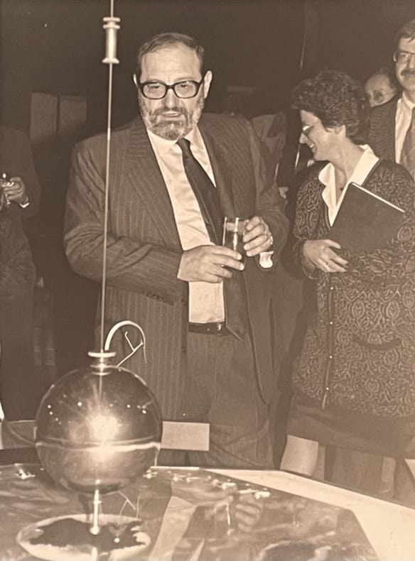 L'écrivain, en visite au Musée du Conservatoire des Arts et Métiers, est photographié devant le fameux pendule de Foucault.