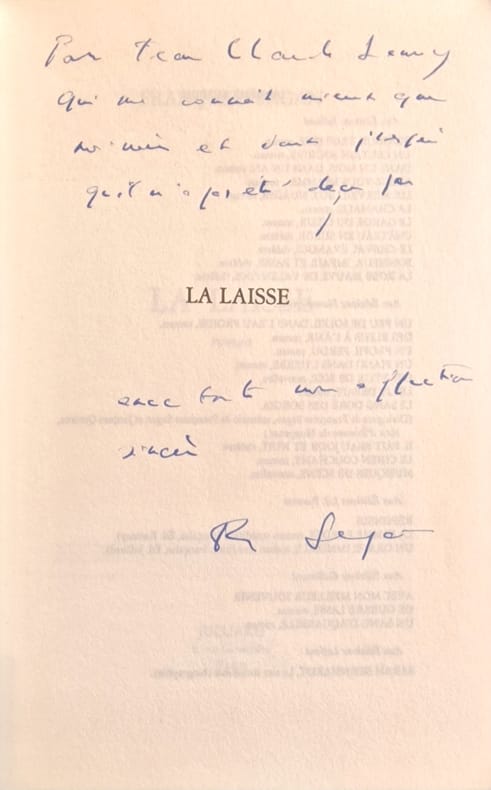 Paris Julliard 1989 1 vol. broché in-8, broché, couverture illustrée, 229 pp. Edition originale sans grand papier de ce roman dans lequel un musicien qui étouffe dans son mariage avec une bourgeoise fortunée voit sa vie remise en question lorsqu'il compose une mélodie qui lui apporte le succès et une possible liberté. Exemplaire enrichi d'un bel envoi de l'auteur à son biographe : "à Jean-Claude Lamy, qui me connaît mieux que moi-même et dont j'espère qu'il n'a pas été déçu par La Laisse, avec toute mon affection sincère, Françoise Sagan".