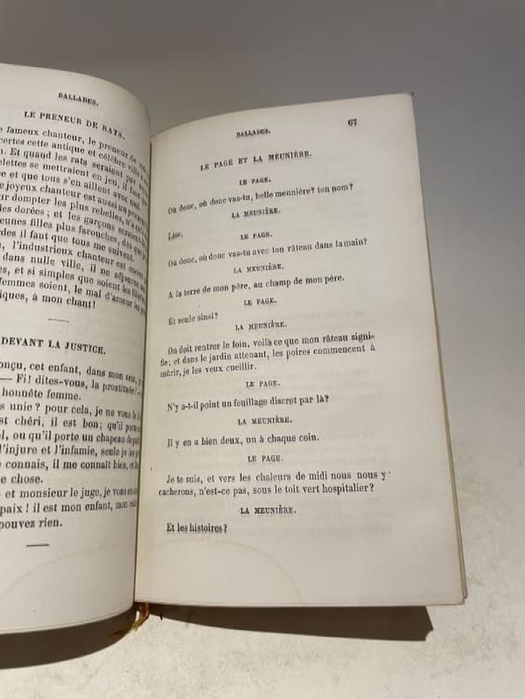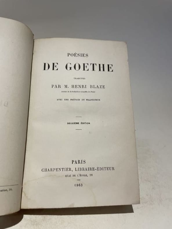 Auteur de la traduction de Faust. Avec une préface du traducteur. Paris. Charpentier. 1843. In-8 (123 x 192mm) cartonnage bradel papier marbré, couverture jaune imprimée conservée, 3ff.n.ch., XXIV, 310 pages. Rousseurs surtout aux 3 premières pages, coiffe supérieure absente, sinon bon exemplaire dans une élégante reliure postérieure. Edition originale de la traduction française.