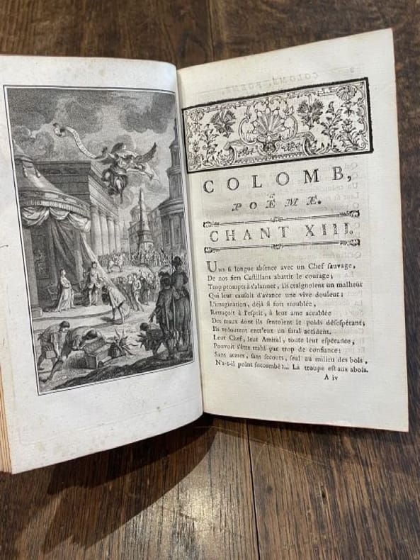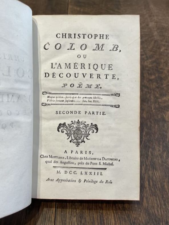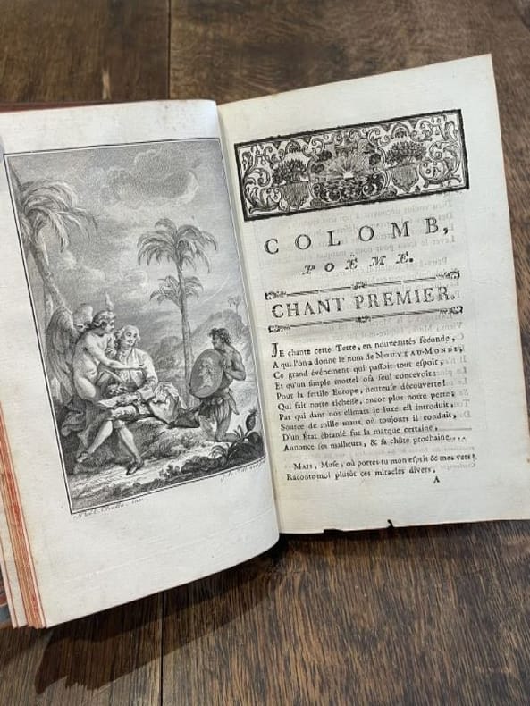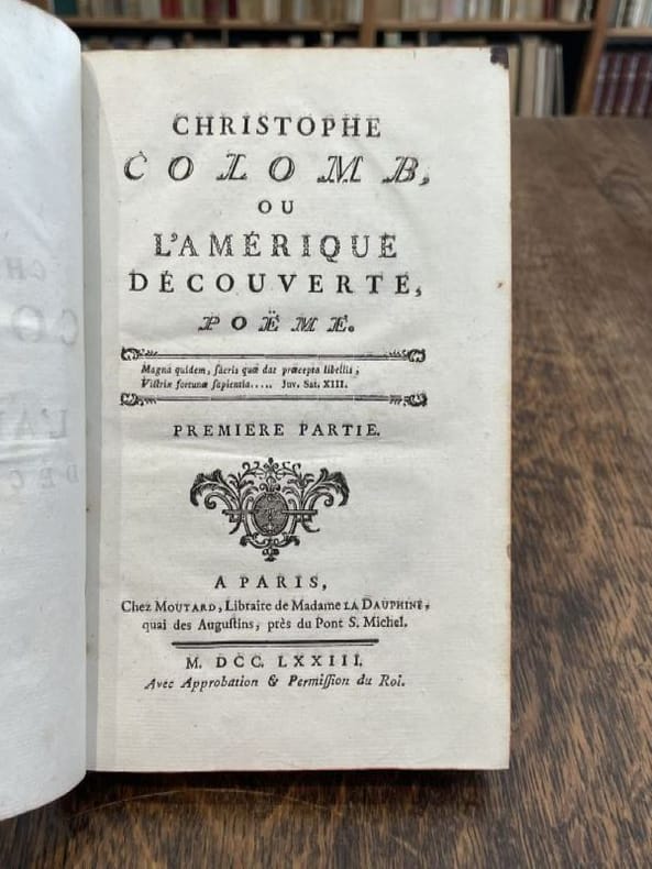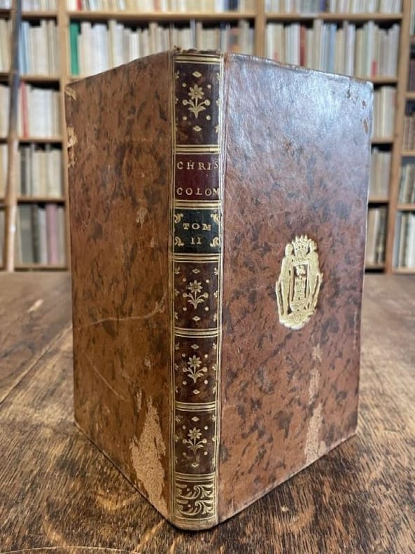 Paris Moutard 1773 2 vol. Relié 2 vol. in-8, plein veau fauve marbré, dos lisses ornés de fleurons dorés, pièces de titre et de tomaison de maroquin rouge et vert, armes dorées sur les plats supérieurs, tranches rouges, XV + 217 et 266 pp. Edition originale de ce poème épique en 24 chants, illustrée de deux beaux frontispices allégoriques. Natif de La Rochelle où il présida l'Académie des belles lettres, sciences et arts, l'auteur (1710-1776) s'établit à Saint Domingue où il fut secrétaire de la Société d'agriculture du Cap français. Petites galeries de vers et épidermures sur les plats n'affectant pas les armes dorées, ex-libris gravé du marquis de Lajudie.
