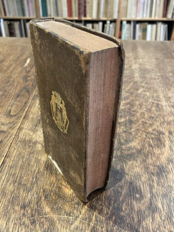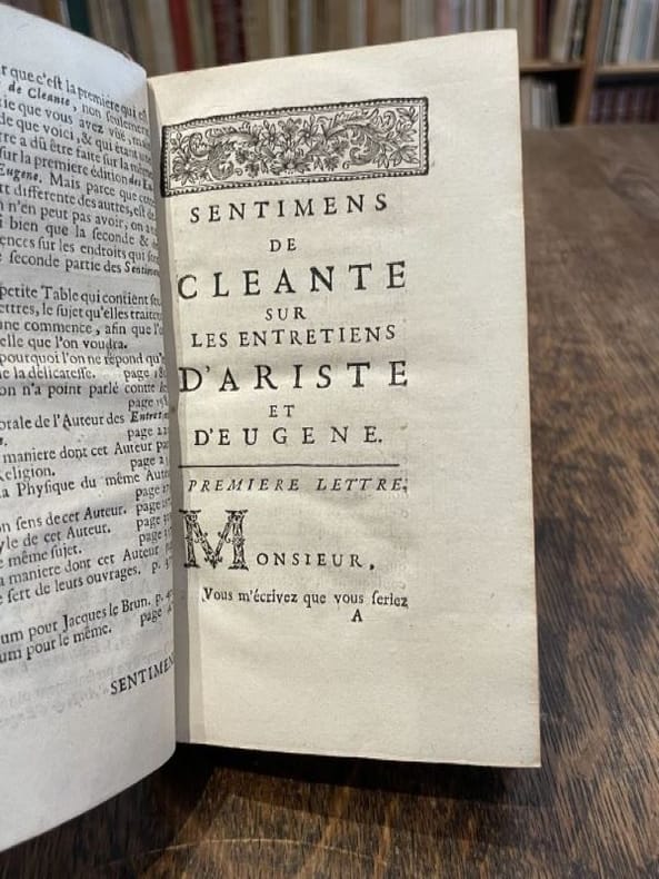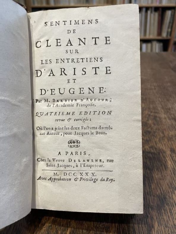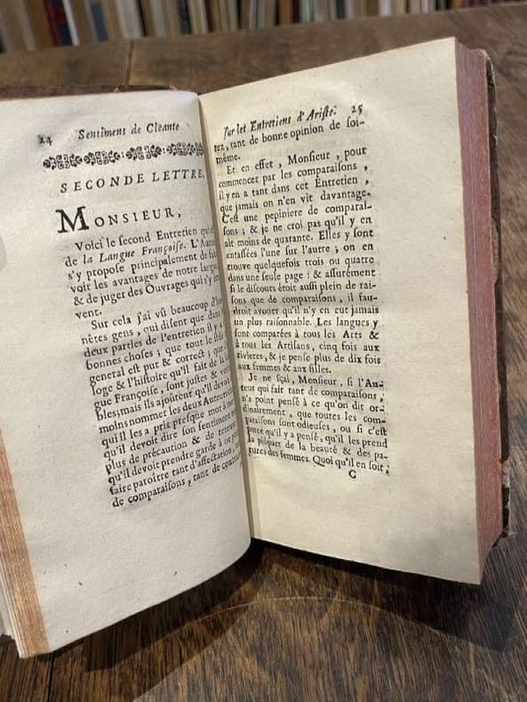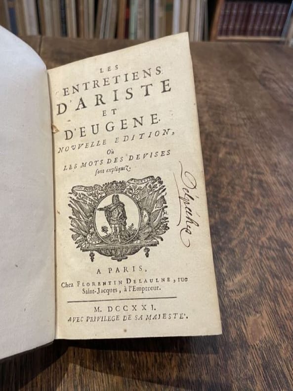 Paris Delaulne 1721-1730 2 vol. relié 2 vol. in-12, pleine basane fauve mouchetée, dos à nerfs ornés de fleurons dorés, pièce de titre de maroquin lavallière, armes dorées sur les plats supérieurs, tranches mouchetées rouges, 4 ff. non chiffrés, 516 pp et 8 ff. non chiffrés - XXI pp., 1 f. non ch., 494 pp. et 1 f. non ch. Belle réunion en reliure uniforme de ces célèbres dialogues à visées pédagogiques, où s'exprime le goût classique du Père Bouhours, et leur critique en règle par Barbier d'Aucour. Les deux ouvrages ont paru pour la première fois en 1671 et seront réédités tout au long du XVIIIe siècle. Légers frottements et épidermures aux coupes, sinon bonnes reliures d'époque aux armes et avec l'ex-libris gravé du marquis de Lajudie.