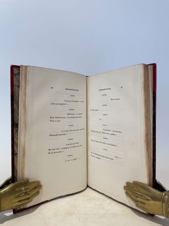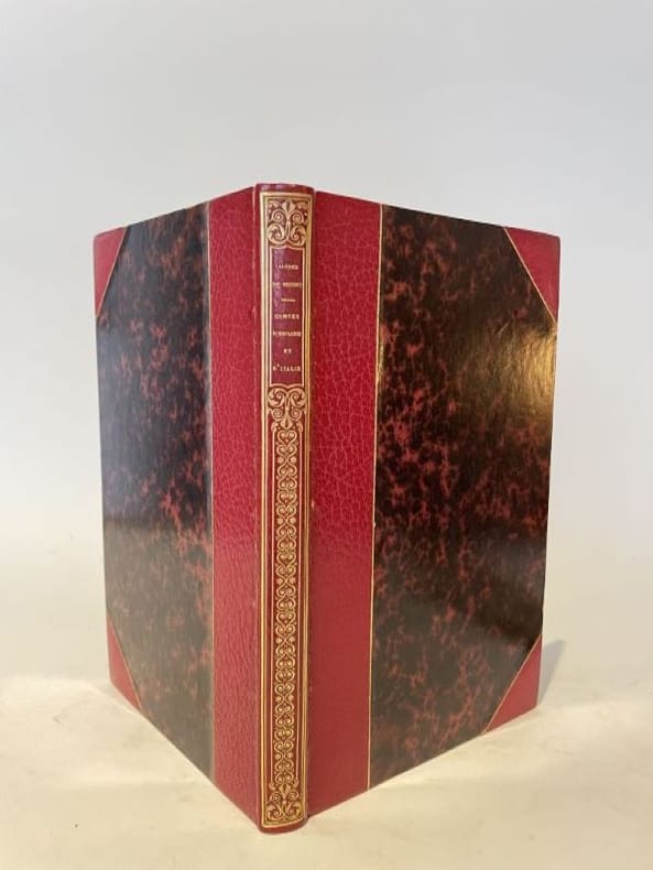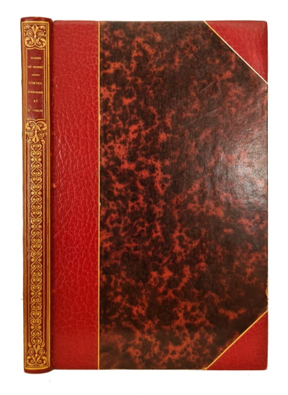 Edition originale du premier recueil de poésies de Musset, elle est fort rare, n'ayant été imprimée qu'à 500 exemplaires. Exemplaire avec le texte original, avant les 3 cartons.Il existe également des pages de titre à l'adresse "Paris, A. Levasseur, ...", et à l'adresse "Paris, A. Levasseur, ... Urbain Canel, ...", ce dernier comprenant les 3 cartons, indiqués dans Vicaire. Les Contes d'Espagne et d'Italie (1829), témoignent d'un style purement romantique, mais on y trouve des outrances, des gamineries et de malicieuses parodies qui offusquèrent les chefs de l'école romantique (Mardoche, la Ballade à la lune). Exemplaire relié avec:MUSSET, Alfred de: Un spectacle dans un fauteuil. 288 p. (la première page "Au Lecteur" un peu poussiéreuse) + 2 ff. (table), lég. taches d'eau marg. à partir de ca. p. 153, non rogné.La collation de cet exemplaire correspond à celle donnée pour l'ÉDITION ORIGINALE par Vicaire, publiée à Paris, Librairie d'Eugène Renduel, 1833, in-8. A notre exemplaire manquent les 2 ff. prélim. (faux-titre; au verso, nom de l'imprimeur et titre). Vicaire V/1239. Image disp.