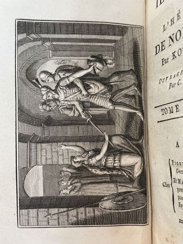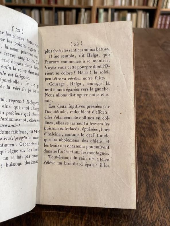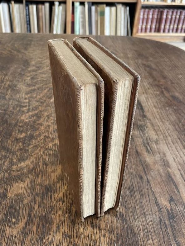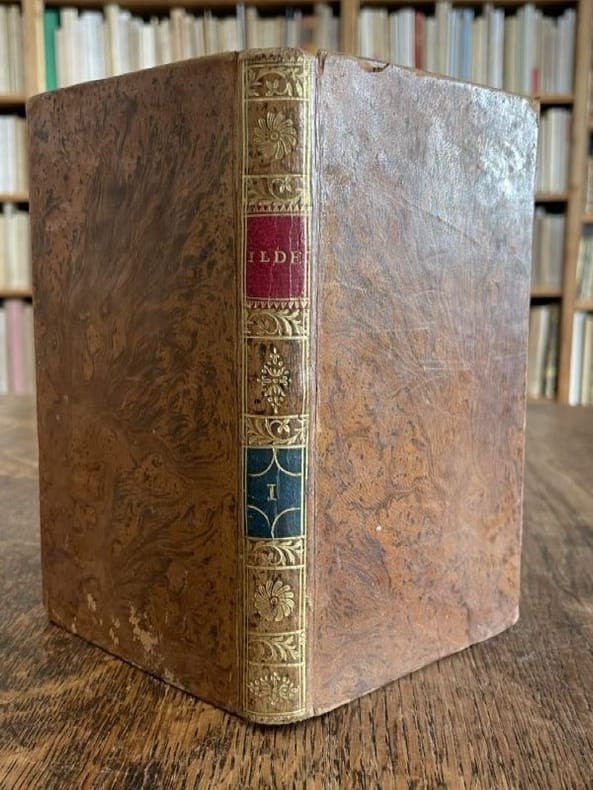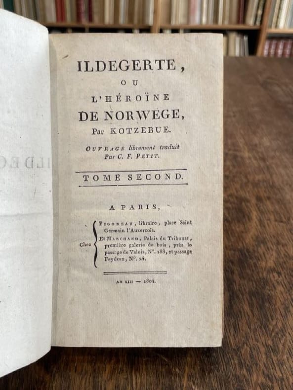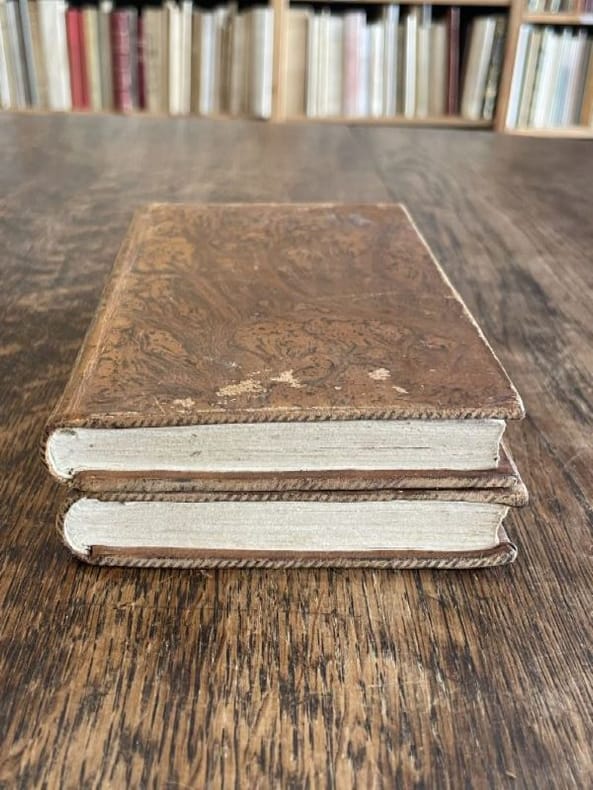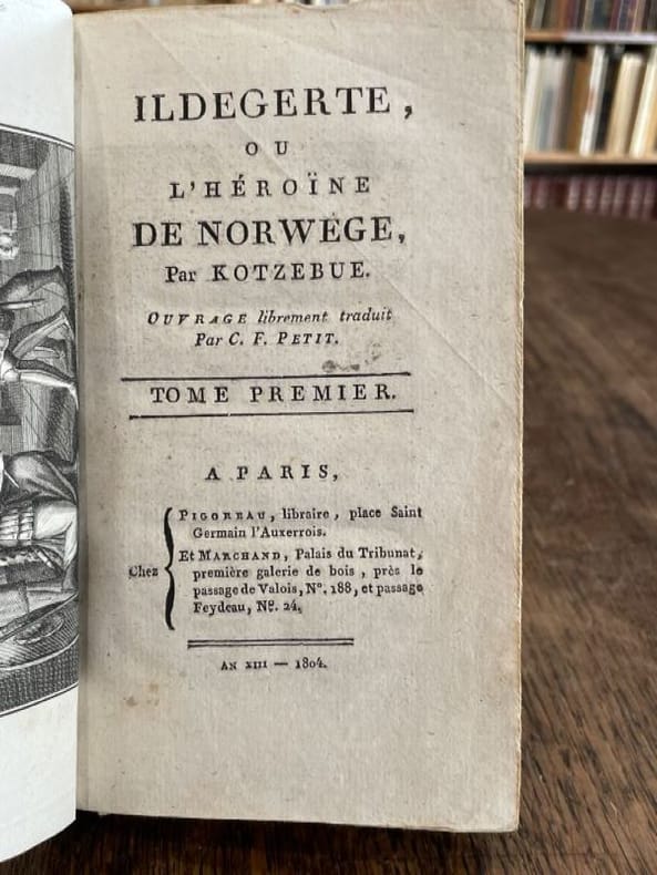 Paris Pigoreau et Marchand 1804 2 vol. relié 2 vol. in-12, basane fauve flammée, dos lisses ornés de pièces de titre et de tomaison de maroquin rouge et vert et de frises et fleurons dorés, tranches mouchetées, 191 et 180-(5) pp. Edition originale française ornée d'un frontispice gravé. Issu d'une famille de la noblesse balto-saxonne, le très prolixe dramaturge allemand August von Kotzebüe (1761-1819) s'acquitta aussi de missions de renseignement au service de l'Empire russe. Ses articles de propagande réactionnaires suscitant l'aversion de la jeunesse allemande, il fut poignardé à Mannheim par l'étudiant Karl Ludwig Sand, militant pour les libertés civiques. Cet assassinat romantique nourrira la base politique du drame "Léo Burkhart" écrit par Nerval et Dumas. Coiffes un peu rognées, mais charmante reliure de l'époque.