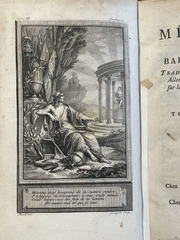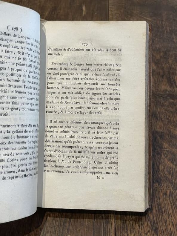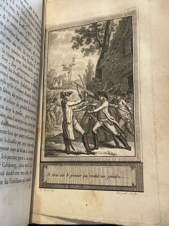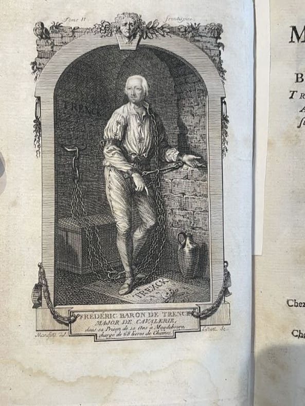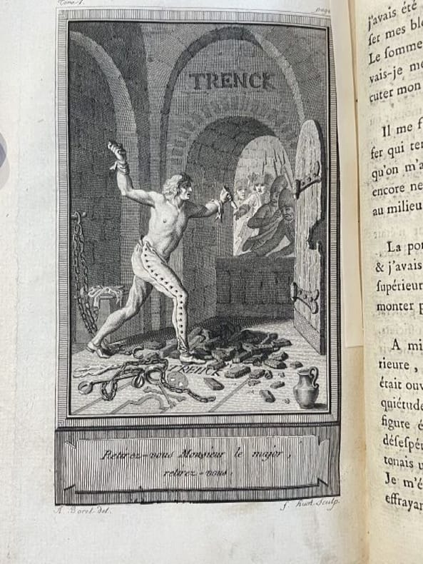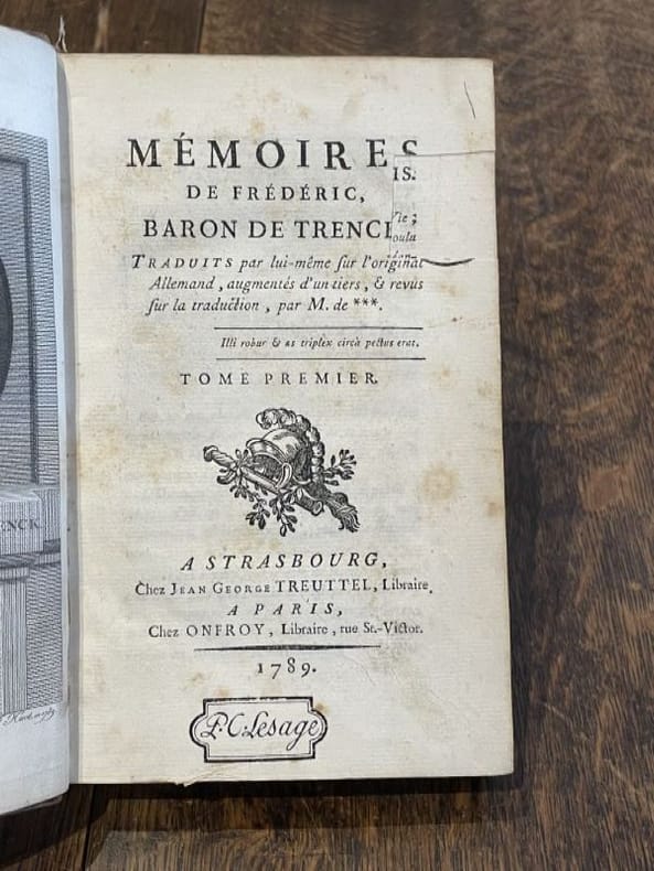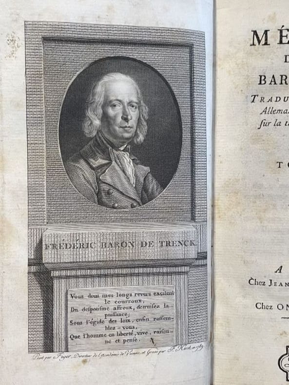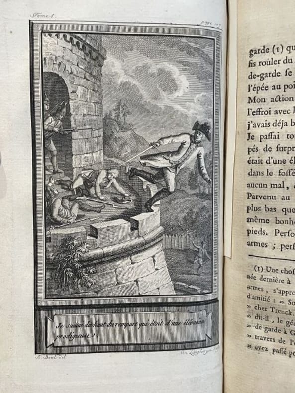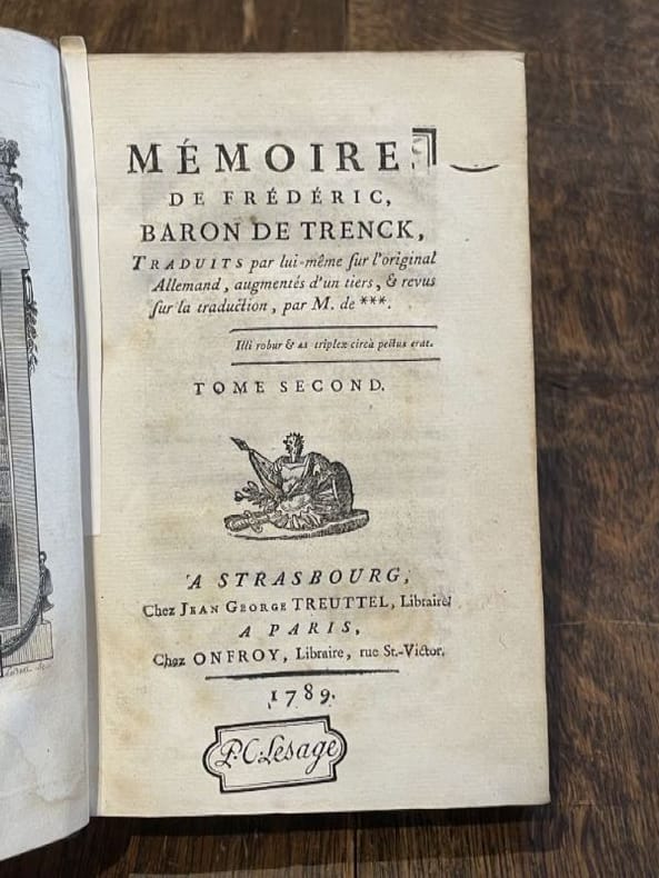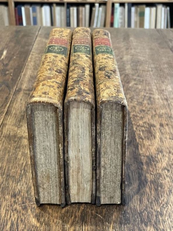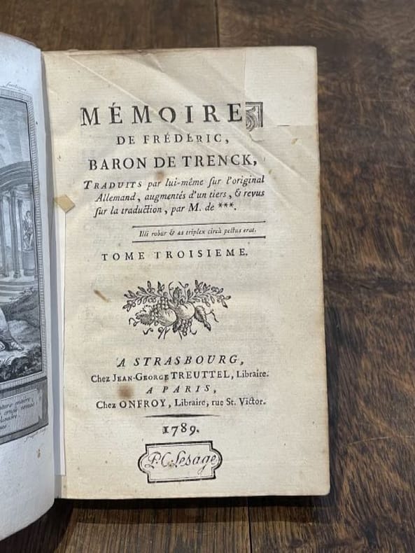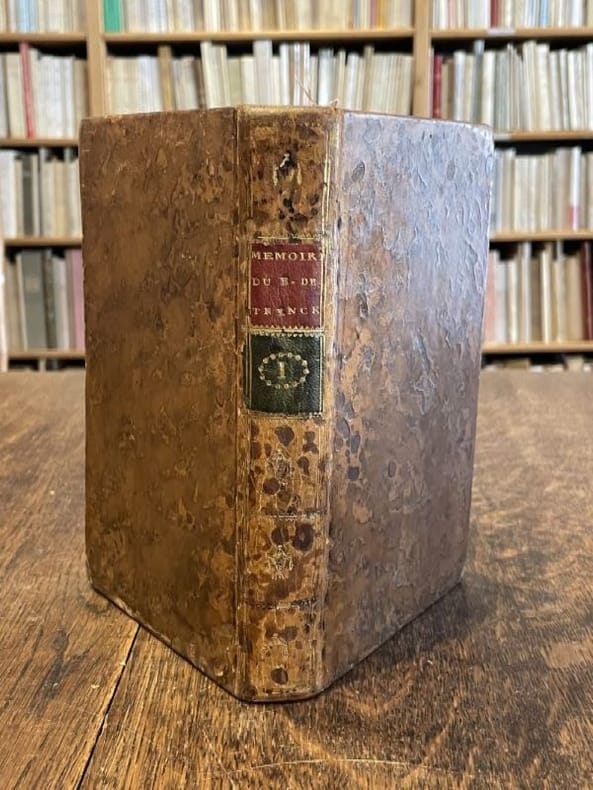 Strasbourg et Paris Jean-Georges Treuttel et Onfroy 1789 3 vol. relié 3 vol. in-8, veau glacé fauve flammé, dos lisses ornés de pièces de titre et de tomaison de maroquin rouge et vert et de filets et fleurons dorés, tranches mouchetées, VIII-XXX-419-(3), 400 et 403 pp. Premier tirage de cette édition illustrée comprenant un portrait et 9 figures de Borel gravées par Mansfeld, Lebert, etc. (Cohen, 986). Pittoresque récit du célèbre aventurier allemand, officier d'ordonnance de Frédéric II, qui sera guillotiné en 1794 comme espion à Paris. Reliure d'époque un peu épidermée mais très décorative, une petite découpe en page de titre de chaque volume.