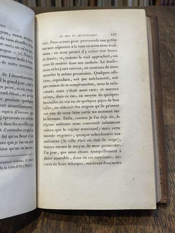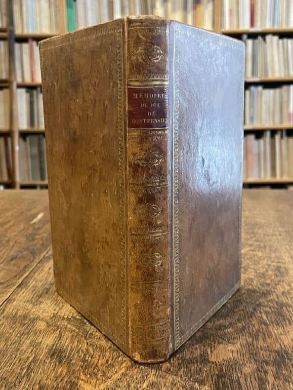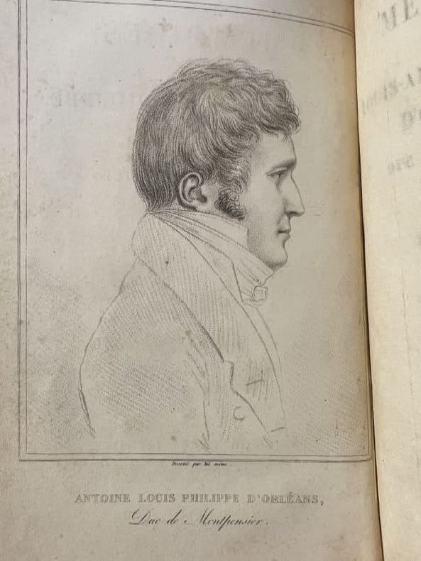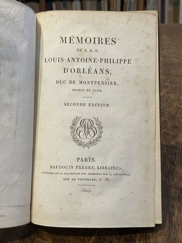 Paris Baudouin frères 1824 1 vol. relié in-8, veau fauve, dos lisse orné de filets et fleurons dorés, pièce de titre de maroquin rouge, frise dorée en encadrement sur les plats, tranches mouchetées, XV + 288 pp. Seconde édition ornée en frontispice d'un portrait de l'auteur exécuté par lui-même. Louis-Antoine-Philippe d'Orléans, duc de Montpensier (1775-1807) servit au grade d'officier dans l'armée de Dumouriez. Impliqué par le décret rendu contre tous les Bourbons, il fut arrêté et emprisonné à Marseille puis à Paris. Libéré en 1797, il passa en Amérique puis vécut avec son frère le comte de Beaujolais en Grande-Bretagne où la tuberculose l'emporta à 32 ans. Bel exemplaire en reliure d'époque, bien conservée.
