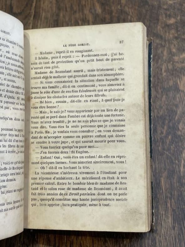 La maison Vauquer est une pension parisienne où se côtoient des résidents que tout oppose, et pourtant inexorablement liés : Rastignac, un jeune étudiant en droit, le Père Goriot, un ancien fabriquant de vermicelles, ou encore le mystérieux Vautrin. Tous ont leurs secrets et leurs faiblesses : Rastignac, obsédé par la haute société, délaisse ses études pour tenter de s’y intégrer ; Vautrin cache un passé douloureux ; le Père Goriot s’est ruiné pour ses filles ingrates. Jolie reliure, demi cuir, 18x12cm, très bel état intérieur, 255pp. Couvertures illustrée avec dos conservées. Librairie Grund, 1935 ref/273