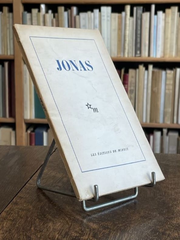 Paris Editions de Minuit 1955 1 vol. Broché in-12, broché, 63 pp.Edition originale qui comprend, outre la traduction, un commentaire de "Jonas", ainsi qu'une étude sur la question juivre par Jérôme Lindon (1925-2001), "Existence des juifs". Le directeur des Editions de Minuit travailla pendant près de dix ans à cette traduction, à l'époque où il suivait les cours d'hébreu de Marcus Cohn.Tirage unique à 343 exemplaires sur vélin, celui-ci hors commerce, justifié par Jérôme Lindon avec un bel envoi à André Chouraqui, qui allait lui-même entreprendre une traduction de la Bible. Couverture un peu salie.Bibliographie des Editions de Minuit, n° 212.
