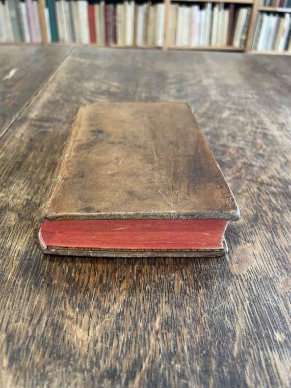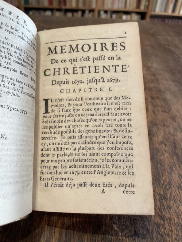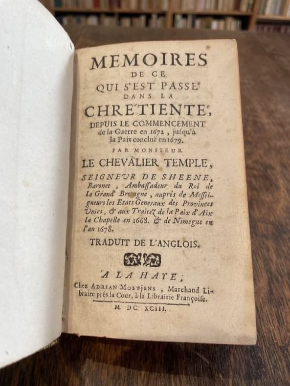 La Haye Adrian Moetjens 1693 1 vol. relié in-12, pleine basane fauve, dos à nerfs orné de fleurons et filets dorés, pièce de titre et deux caissons à fleurons de veau rouge, roulette dorée sur les coupes et intérieures, tranches rouges, 12 ff. + 444 pp. Ouvrage relatif à la guerre de Hollande (1672-1678) par le chevalier Temple qui y fut ambassadeur du roi d'Angleterre. Exemplaire en reliure d'époque très légèrement frottée.