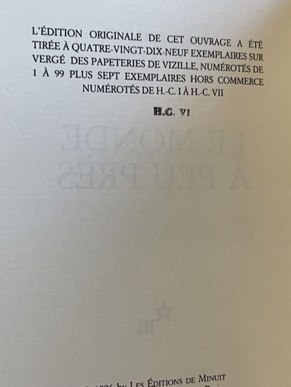 Paris Editions de Minuit 1996 1 vol. broché in-8, broché, non coupé, 253 pp. Edition originale. Un des 106 exemplaires numérotés sur vergé de Vizille (seul tirage en grand papier), et parmi ceux-ci l'un des 7 hors commerce (ex. n° VI), avec un bel envoi autographe signé de l'auteur à Henri Causse, directeur commercial des éditions de Minuit. En parfait état.