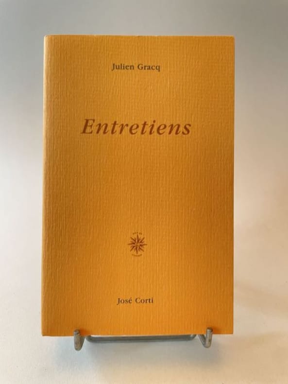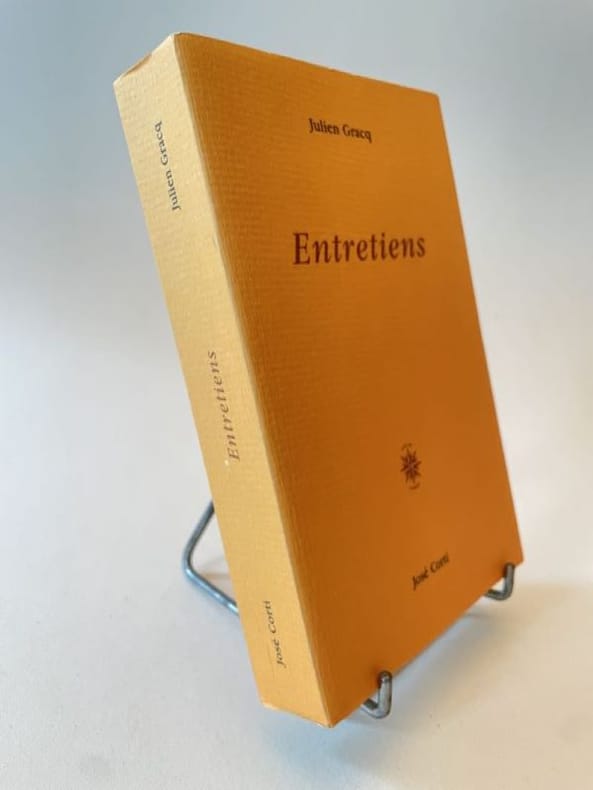 Paris Corti 2002 1 vol. broché in-12, broché, non coupé, 314 pp. Edition originale de ces entretiens qui s’échelonnent sur plus de trente ans. La variété des interlocuteurs comme celle des questions finit par former un ensemble très complet de signes de piste pour aborder l'oeuvre de Gracq : méthodes de travail, processus d'écriture, influence jouée par sa formation de géographe et d’historien dans son travail, mises au point sur ses lectures et préférences dans les autres arts, etc. Que Julien Gracq se soit parcimonieusement prêté au jeu de l’interview rend ce volume d’autant plus éloquent. Un des 135 exemplaires numérotés sur vergé Conqueror blanc, seul tirage en grand papier. En parfait état.