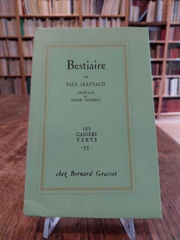 Paris Grasset, coll. "Les Cahiers verts" 1959 1 vol. broché in-12, broché, couverture rempliée, non coupé, 252 pp. Edition originale de ce recueil composé des parties du Journal consacrées aux bêtes, que Léautaud lui-même a supprimées pour l'édition en volumes. Un des 52 exemplaires de tête numérotés sur vergé de Montval. En belle condition.