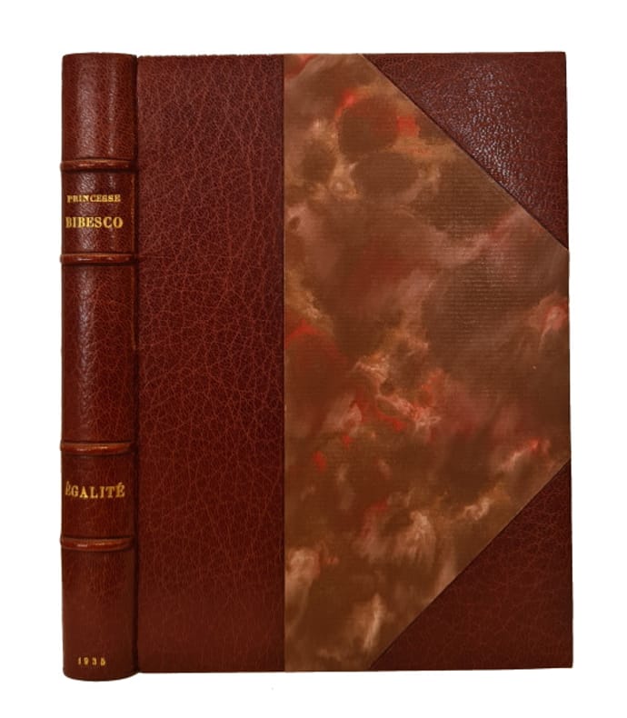 Paris Grasset, coll. "Pour mon plaisir" 1935 1 vol. relié in-12, demi-maroquin à gros grain marron à coins, dos à quatre nerfs, tête dorée, non rogné, couvertures et dos conservés (Semet & Plumelle), 242 pp. Édition originale de cet amusant roman politico-sentimental dans lequel Marthe Bibesco (1886-1973) s'est inspiré de sa courte liaison avec le ministre et diplomate Henry de Jouvenel. Un des 12 exemplaires de tête numérotés sur Japon impérial, avec un sympathique envoi autographe signé de l'autrice à Louis Brun : "Liberté, Egalité, Amitié, parce qu'il aime les livres comme l'ours brun aime le miel des abeilles" (allusion à l'ex-libris gravé du directeur des éditions Grasset qui figure en vis-à-vis). Très bel exemplaire, à toutes marges.