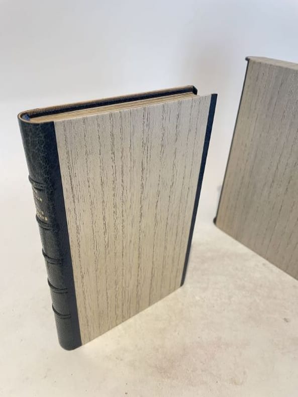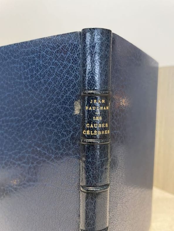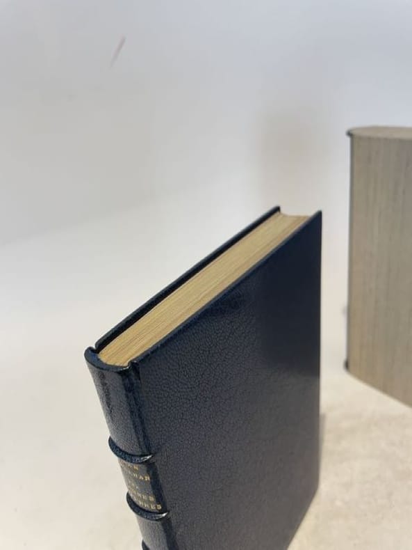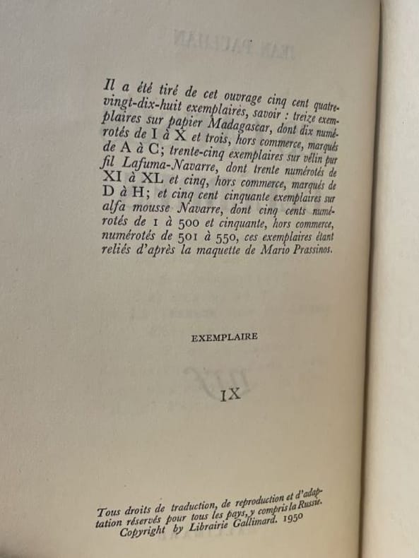 Paris Gallimard 1950 1 vol. relié in-12, plein maroquin à gros grain bleu canard, dos à nerfs, fine bordure intérieure de même maroquin bleu canard avec encadrement doré, doublures et gardes de box beige, tranches dorées, couvertures et dos conservés, chemise demi-maroquin bleu canard à fines bandes, étui bordé (J.-P. Miguet), 135 pp. Édition originale collective. Un des 13 exemplaires de tête numérotés sur Madagascar. Superbe reliure janséniste de Miguet.