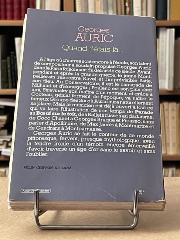 Paris Grasset 1979 1 vol. broché in-8, broché, couverture illustrée d'un portrait par Cocteau, 222 pp. Édition originale de ce recueil de souvenirs. Un des 24 exemplaires sur vélin Chiffon de Lana, seul tirage en grand papier, celui-ci numéroté hors commerce avec un superbe envoi autographe signé de l'auteur : "Pour Nathalie Sarraute, timidement, ces mots "trop doux, assouplis, amollis", avec toute mon admiration et, si elle le veut bien, toute mon amitié. Georges Auric, 19.III.82". En bonne condition.