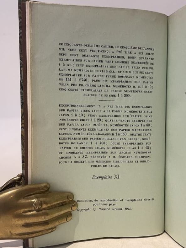 Paris Grasset, coll. "Les cahiers verts" 1925 1 vol. relié in-12, demi-maroquin vert, dos à nerfs, tête dorée, non rogné, couvertures et dos conservés (Honnelaître), 333 pp. Édition originale. Un des 40 exemplaires numérotés sur papier vert lumière. Parfaite reliure signée.