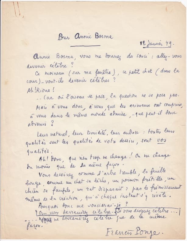 Une page in-4, "12 janvier 49". Manuscrit de ce poème publié en préface de Mes amies les bêtes (Mouton et Cie, La Haye, 20 juin 1949) d'Annie Bosma qui en signe le texte et les dessins. "Annie Bosma, vous me donnez du souci : allez-vous devenir célèbre?Ce moineau (sur ma fenêtre), ce petit chat (dans la cour) - vont-ils devenir célèbres?Ah! Rions!... Car où l'oiseau se pose, la question ne se pose pas. Mais à vous donc, à vous, que les animaux ont comrpise, à vous dans le même monde admise, - que peut-il donc advenir? Leur naturel, leur timidité, leur audace : toutes leurs qualités sont les qualités de votre dessin, sont vos qualités"...Trace d'agrafe en haut à droite, mais très beau document. Les manuscrits en mains privées de Ponge sont peu courants, ses archives ayant été versées à la Bibliothèque Jacques Doucet.