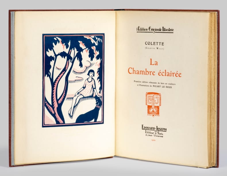 Paris Edouard Joseph, coll. "L'Edition originale illustrée" 1920 1 vol. relié in-8, cartonnage bradel de papier brique, tête dorée, non rogné, couverture illustrée d'une vignette en couleurs et dos conservés (Honnelaître), 196 pp. Edition originale illustrée en frontispice d'un bois en deux couleurs et de nombreux dessins en noir in-texte par Picart Le Doux. Exemplaire sur vélin parcheminé Lafuma non numéroté et complété à la justification par cet amusant envoi autographe signé à Francis Carco : "n°? Mais "numéro un", voyons, comme la tendresse que je porte à Carco. Colette de Jouvenel".Largement inspiré par la Première Guerre mondiale, le recueil, constitué pour l’essentiel d’articles parus dans Excelsior, complète Les Heures longues (1917) et met en scène tour à tour Bel-Gazou, la fille unique de l’écrivaine qui fait ici une de ses premières apparitions dans l’œuvre, les bêtes familières et les êtres malmenés par l’Histoire. Colette y évoque avec justesse, émotion et drôlerie parfois, la vie à l’arrière, cet envers du front dont elle est sans doute une des plus fines observatrices. Colette avait rencontré Francis Carco, de treize ans son cadet, en 1918 devant les bureaux du journal L’Eclair. Entre l’auteur de Jésus-la-Caille et la célèbre «vagabonde», ce fut un véritable coup de foudre littéraire et amical comme en témoigne cette dédicace inédite, deux ans après leur rencontre. Une amitié P.L.V. comme l’écrit Carco, c’est-à-dire «Pour La Vie», dont le ciment fut une fascination commune pour le Paris interlope, la poésie des rues et des cabarets de la Butte. Colette et Carco échangèrent une abondante correspondance et se retrouvèrent en 1945 à la table des Goncourt. Après la mort de sa «grrrrande amie», Carco lui consacra un magnifique livre d’hommage: Colette, "mon ami" (1955). Très belle provenance. (Notice de Frédéric Maget pour le catalogue de la collection Colette des Clarac)
