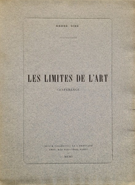 Paris Petite Collection de l'Ermitage 1901 1 vol. broché plaquette in-8, brochée, 27 pp. Édition originale tirée à 150 exemplaires numérotés sur Hollande van Gelder, « plus quelques exemplaires sans numéro » [Naville 45] comme celui-ci.Gide avait été convié à donner une conférence à l’occasion de l’exposition des artistes indépendants qui s’ouvrait en avril 1901, mais il dut y renoncer, accaparé par la représentation du Roi Candaule, la rédaction de L’Immoraliste et de ses souvenirs sur Oscar Wilde.Mais Gide a promis à son ami Édouard Ducoté le texte de sa conférence. Il s’escrime avec grande peine, comme il le confie à Henri Ghéon le 2 août 1901 : « elle (la conférence) dévore tout mon loisir ; elle m’irrite, elle m’exaspère, j’ai peur de n’y dire que des c...ries. » Tout aussi insatisfait qu’il le prétend, il publie la conférence dans la revue L’Ermitage en août 1901, puis dans la « Petite collection », et la reprend enfin dans Prétextes, preuve de l’importance qu’il attache à ce texte. Et pour cause, Gide y exprime avec passion ses convictions et pose, comme un portrait en creux, sa définition de l’art comme de l’artiste.