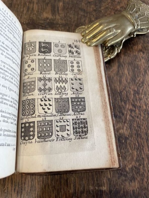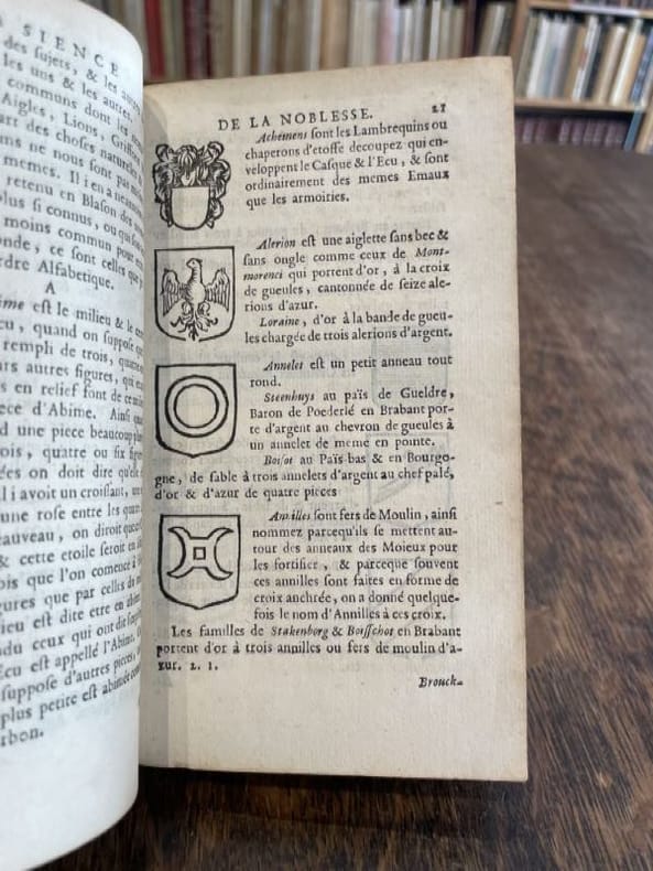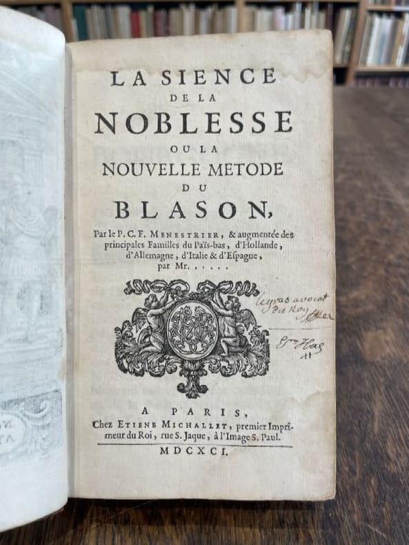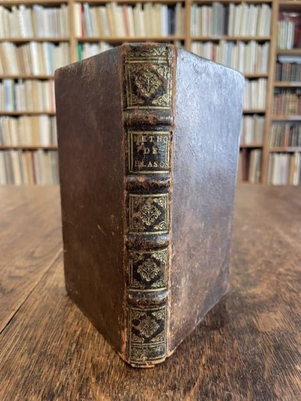 Paris [Bruxelles] Chez Etiene Michallet [Foppens] 1691 1 vol. relié in-12, veau moucheté, dos à nerfs, avec caissons ornés de petits fers et fleurons dorés, tranches mouchetées, [9] ff. (épître, préface) + 204 pp. + [8] ff. (table). Édition bruxelloise reprenant l'édition de 1688 publiée à Lyon et Paris de La Méthode du Blason. Elle est ornée d'un frontispice et de 10 planches de blasons gravées au burin. « Par les modifications apportées à l'ouvrage de Ménestrier, ce livre est véritablement un ouvrage nouveau » (Saffroy, I, 2212). Bon exemplaire en reliure d'époque (mors frottés).