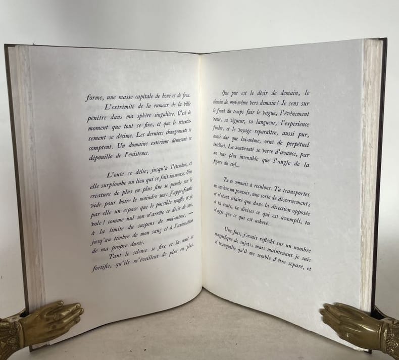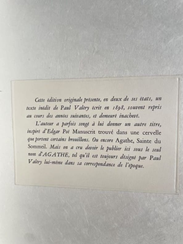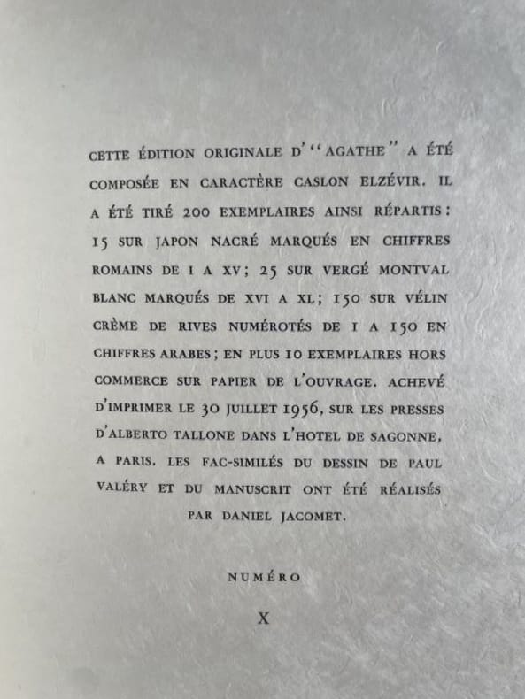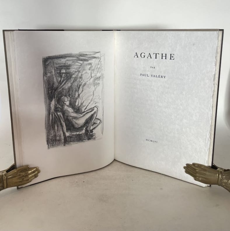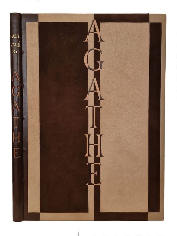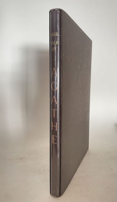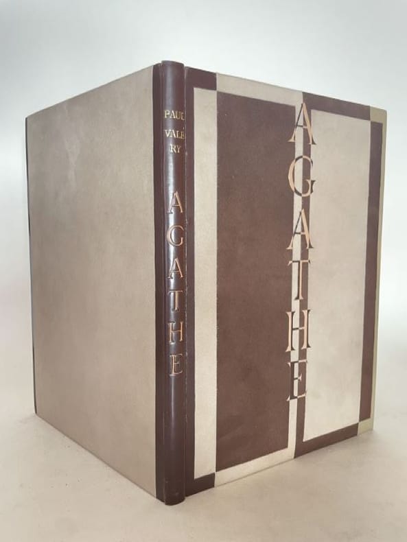 Paris s.é. [typogaphie A. Tallone) 1956 1 vol. relié in-4, reliure de box et de daim marron et beige, dos lisse, décor mosaïqué géométrique de daim avec titre sur le premier plat, chemise cartonnée marron à dos transparent, étui cartonné (P.L. Martin - 1959), non paginé. Édition originale illustrée en frontispice d'un dessin de Valéry et proposant in-fine le fac-similé du manuscrit d'Agathe donnant un autre état du texte (14 pp. montées sur onglet). Tirage limité à 200 exemplaires, celui-ci un des 15 de tête numérotés sur Japon nacré, dans une élégante reliure de Martin. Ex-libris "RB". [Karaïskakis & Chapon, 455]