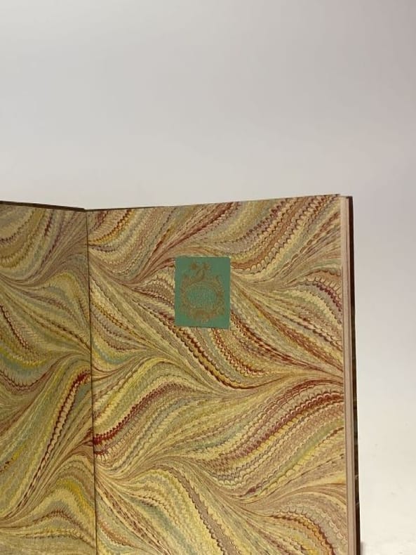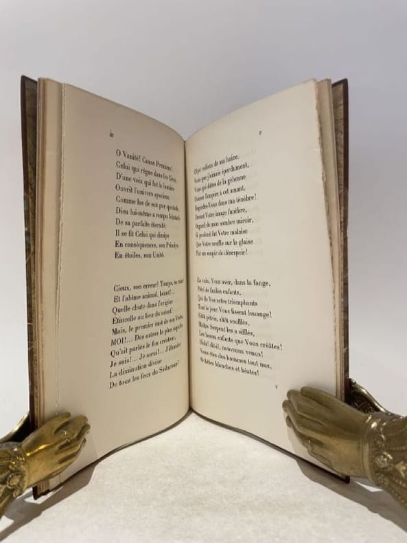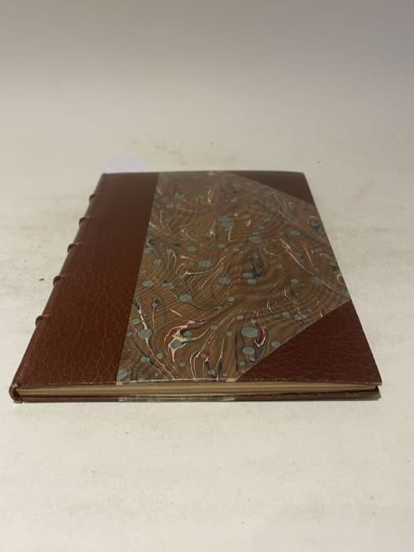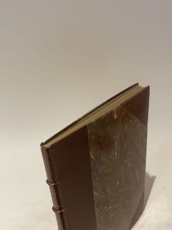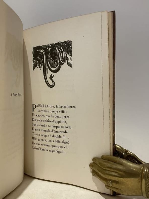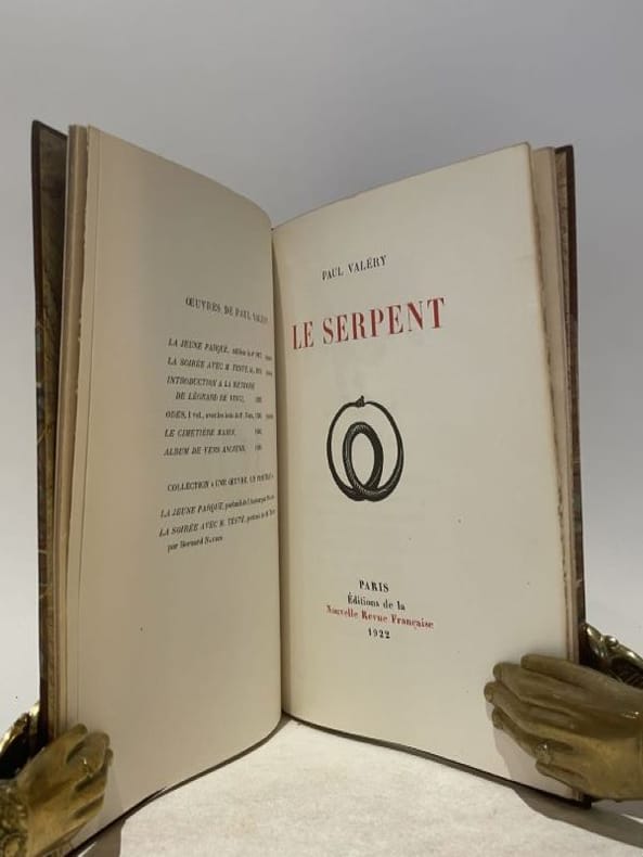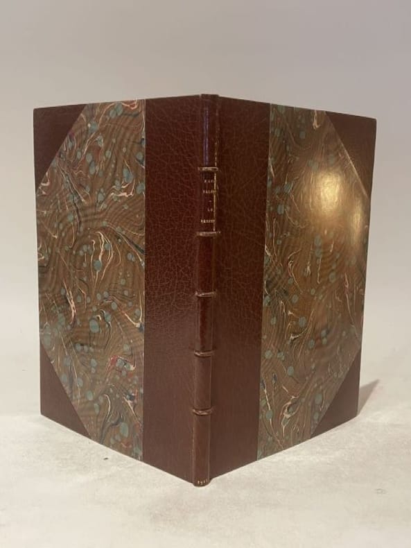 Paris Éditions de la Nouvelle Revue française 1922 1 vol. relié plaquette in-8, demi-maroquin à gros grain havane à coins, dos à nerfs, plats de papier marbré, tête dorée, non rogné, couvertures et dos conservés (P.-L. Martin), 16 pp. Édition originale illustrée de 2 bois gravés par Paul Vera (dont un répété en couverture). Tirage limité à 385 exemplaires, celui-ci un des 30 numérotés sur Hollande à couverture crème. Ex-libris Marcel de Merre. En parfaite condition [Karaïskakis & Chapon, 28].