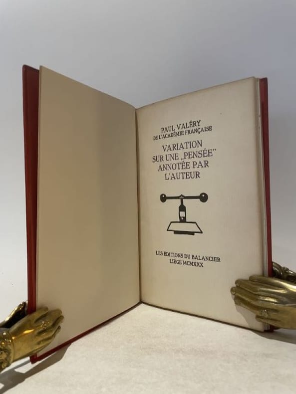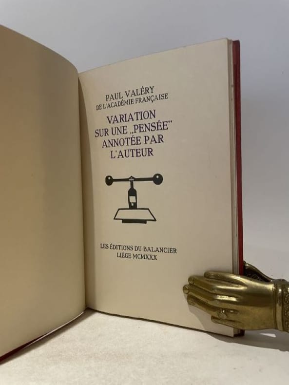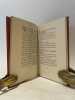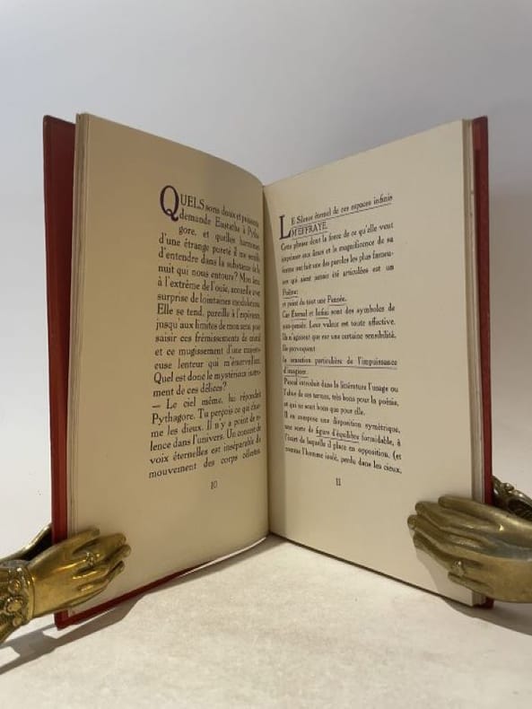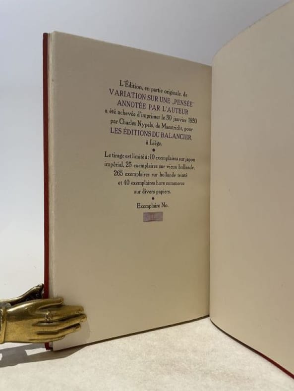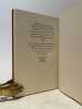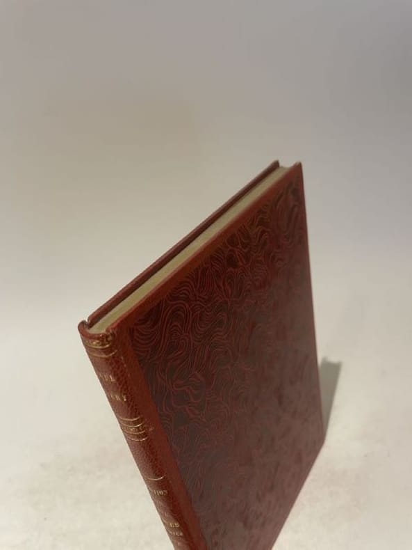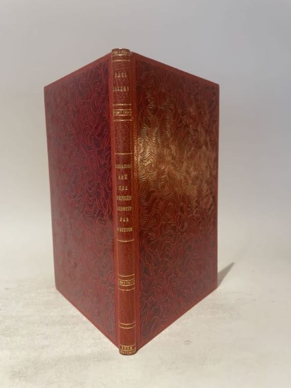 Liège Éditions du Balancier 1930 1 vol. relié in-8, maroquin rouge clair, dos lisse ornementé de filets dorés et de deux fines frises à l'horizontale, papier rouge à décor d'arabesques en relief en incise sur les plats, tête dorée, non rogné, couvertures et dos conservés (Devauchelle), 67 pp. Édition en partie originale. Un des 10 exemplaires de tête numérotés sur Japon impérial, dans une belle reliure, en parfaite condition [Karaïskakis & Chapon, 146].