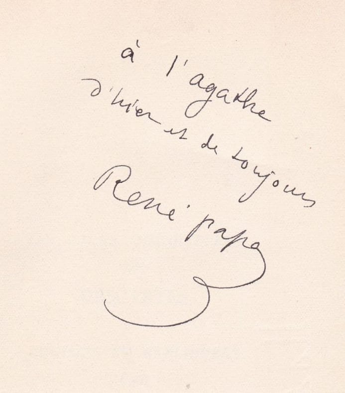 Paris Editions Corrêa 1941 1 vol. broché in-12, broché, sous chemise demi-maroquin bleu nuit et étui doublé de daim sable (Devauchelle), 225 pp. Édition originale. Un des 75 exemplaires numérotés sur pur fil Lafuma, celui-ci enrichi d'un envoi autographe signé de l'auteur à sa fille : "à l'Agathe d'hier et de toujours, René papa". On a joint à cet exemplaire qui provient de la bibliothèque d'Agathe Rouart-Valéry (1906-2006) une carte postale photographique représentant la famille Valéry en promenade Avenue du Bois, juste après la naissance d'Agathe. Au dos, un amusant mot autographe signé de Valéry adressé à André Lebey : "Hommage de la victime / ton P. V.". Cette carte, mentionnée dans la correspondance Valéry-Lebey, date de l'automne 1906. Exemplaire remarquablement établi et en parfaite condition [Karaïskakis & Chapon, 333].