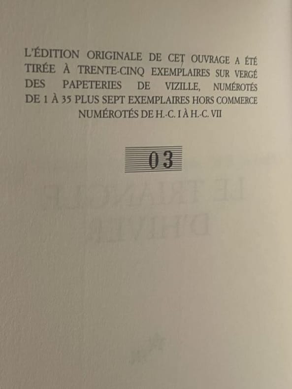 Edition originale. Tirage de tête : un des 35 exemplaires du tirage numéroté sur vergé de Vizille (seul papier) ; plus 7 hors-commerce. ''Mademoiselle ne veut plus travailler. Mademoiselle est criblée de dettes. La vie serait tellement plus simple sous une nouvelle identité. Qu'à cela ne tienne, elle emprunte celle de la romancière Bérénice Beaurivage, change de ville et rencontre l'Inspecteur, dont elle tombe aussitôt amoureuse. C'est sans compter la journaliste Blandine Lenoir, éprise du même homme et résolue à la confondre. Bientôt le soupçon gagne sur tous les côtés du triangle que forment ces trois-là, parfaitement équilatéral.'' Très belle condition.