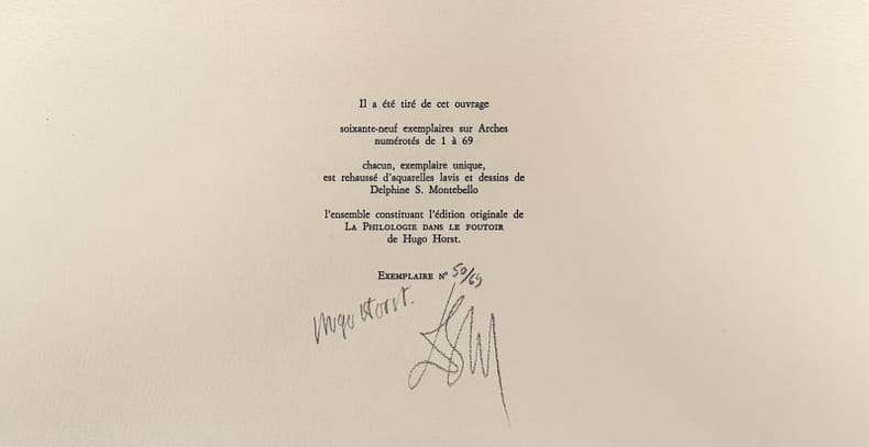Paris Dumerchez 1997 1 vol. broché in-4 oblong (17 x 32 cm), en feuilles, sous couverture à rabats, chemise et étui de toile écrue, non paginé. Edition originale de ces variations détournées de Sade et illustrées de compositions par Delphine S. Montebello. Tirage limité à 69 exemplaires numérotés sur Arches, tous uniques car rehaussés d'aquarelles et lavis originaux de l'artiste.