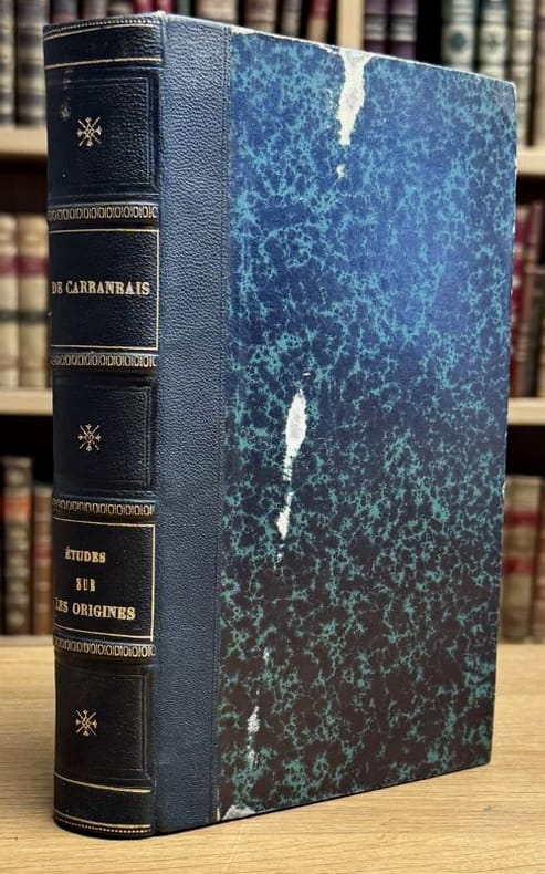 Paris Haton 1876 1 vol. relié in-8, demi-chagrin noir, dos à nerfs ornés de frises dorées, caissons ornés d'un fleuron et d'un filet doré en encadrement, IX + 764 pp. Edition originale peu courante. Eugène de Marin de Carranrais (1824-1887), auteur d'écrits philosophiques et grand défenseur du patrimoine "originel" de la planète. Quelques rousseurs éparses et trois petites épidermures sans gravité sur le premier plat. Annotation manuscrite sur le premier feuillet vierge.