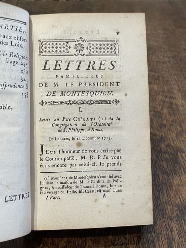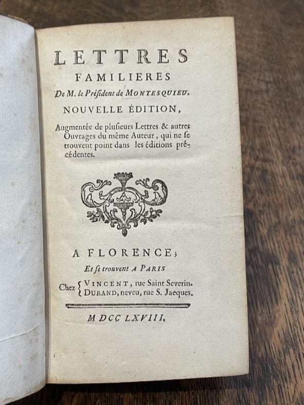 Paris chez Vincent - chez Durand 1768 1 vol. relié in-12, veau brun raciné, dos à nerfs orné de fleurons dorés, tranches rouges, XVII + 392 pp. Les Lettres sont suivies de la Réponse aux observations sur l'Esprit des Loix. Coiffes frottées mais bon exemplaire en reliure d'époque.