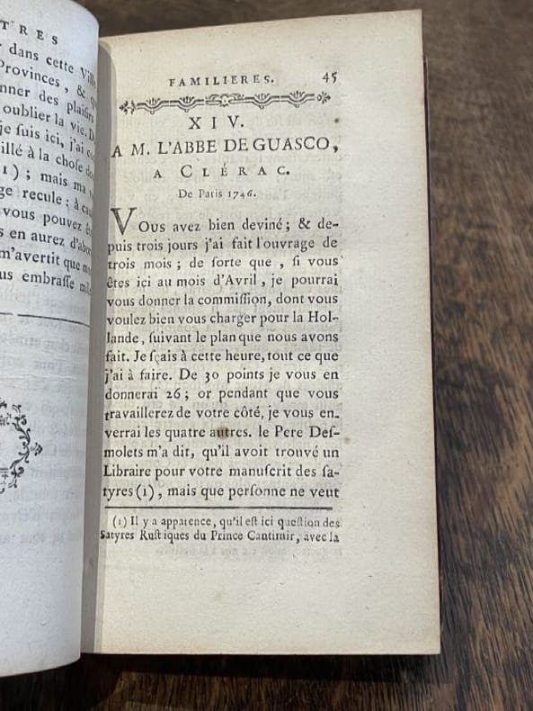 L'EO est donnée par l'abbé Guasco sans nom d'éditeur, ni de pays,imprimé en Italie à Floence avec un titre gravé. Ce volume plusieurs fois réimprimé la même année contient LX lettres sans compter deux lettres de M. de Secondat. Les lettres LIV,LV et LVII sont des plus désagréables pour Madame Geoffrin qui avait rompu avec l'abbé Guasco; les notes de l'abbé Guasco sont plus que satyriques. Il paraitrait que la bonne dame et ses amis auraient été profondement blessés de ces attaques et que pour éviter un scandale on aurait publié une nouvelle édition des "Lettres familières" dont on aurait retranché les lettres concernant madame Geoffrin et sa querelle avec l'abbé. C'est cette nouvelle édition que nous vous proposons; elle contient LXIII lettres, non compris les 2 fragments de M.de Segondat, le "Portrait de madame la duchesse de Mirepoix", et les "Adieux à Cenes" (deux pièces de Montesquieu). Les lettres sont suivies de la "Réponse aux observations". Extrait de l'article concernant les lettres familières de l'édition Laboulaye Garnier 1875.