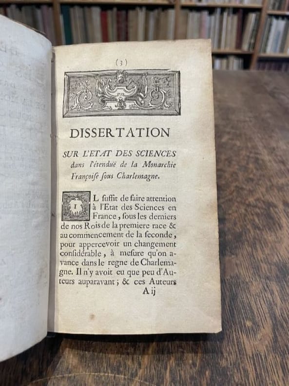 Paris chez Jacques Guerin 1734 1 vol. relié in-12, relié plein veau moucheté, dos à nerfs, caissons ornés de fleurons et décors dorés, pièce de titre de maroquin rouge, tranches rouges, 98 + (4) pp. [Relié à la suite] : GOUJET (Claude-Pierre). De l'état des sciences en France, depuis la mort de Charlemagne jusqu'à celle du roi Robert. Dissertation... Paris, par la Compagnie des Libraires, 1737, (4) + 125 + (3) pp. Réunion de deux opuscules complémentaire traitant des arts et des sciences médiévaux : poésie, musique, sculpture, astronomie, mathématiques, etc. Coiffes et coins émoussés, petit travail de ver en pied du mors inférieur. Cachet de bibliothèque ancien sur la page de titre et cote manuscrite. Sinon exemplaire en bonne condition. Rare.