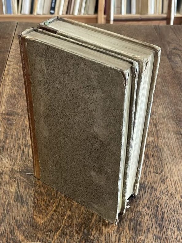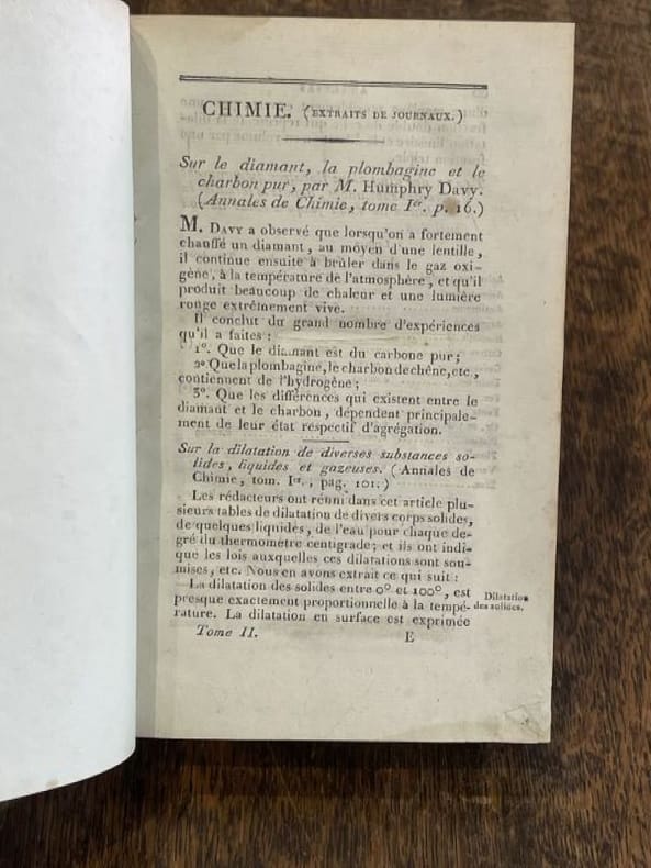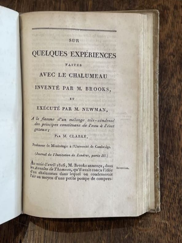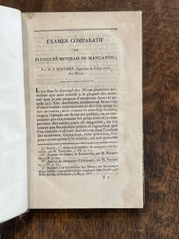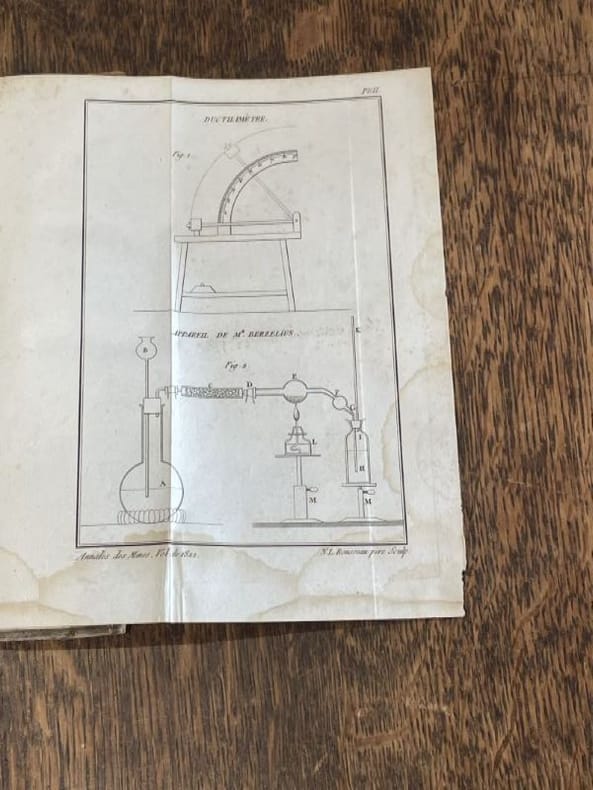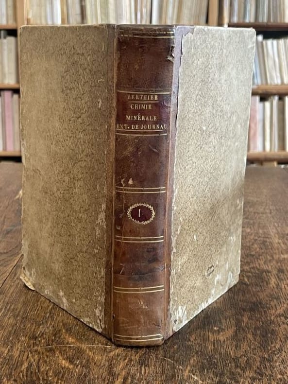 Annales des mines 1822 1 vol. 2 vol. in-8, demi-basane havane, dos lisses ornés de double filets dorés, pièces de titre et de tomaison reteintées sur la peau, paginations non continues. Le premier volume est une réunion de 7 articles de chimie minérale extraits des "annales des mines" vers 1825. Le second volume renferme plus de 15 articles du chimiste Pierre Berthier (1782-1861). Reliures un peu usées avec petits accroc au tome I et mors supérieur du tome II fendillé, sinon bon florilège de chimie minérale du début du XIXe siècle.