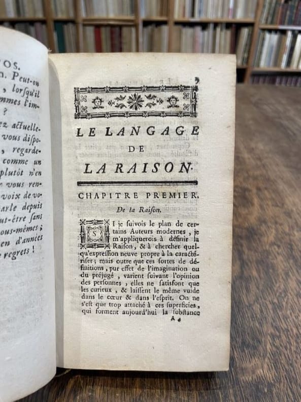 Francfort Chez J. F. Bassompierre - J. Vanden Berghen 1762 in 12 (16,5x10,5) 1 volume reliure pleine basane fauve granitée de l'époque, dos à nerfs orné, pièce de titre de cuir rouge, VII et 88 pages. Relié à la suite du même : LE LANGAGE DE LA RAISON. Par l'Auteur de la Jouissance de soi-même. ( Liège, Chez J. F. Bassompierre 1756) IV et 140 pages. Marquis Louis-Antoine de Caraccioli, Le Mans 1723 - Paris 1803, écrivain français, colonel au service du roi de Pologne, électeur de Saxe. Rare réunion. Bel exemplaire ( Photographies sur demande / We can send pictures of this book on simple request )