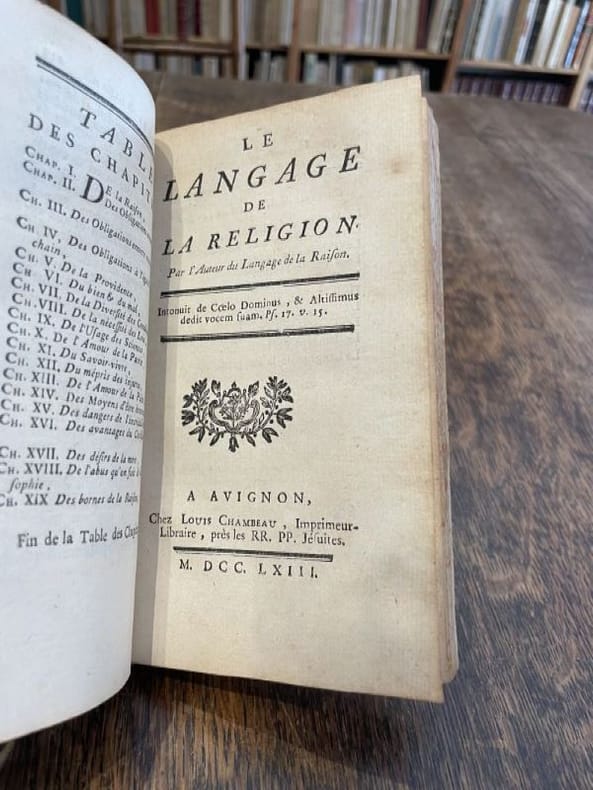 Avignon chez Louis Chambeau 1763 1 vol. relié 2 ouvrages réunis en 1 vol. in-12, plein veau havane marbré, dos lisse orné de fleurons et filets dorés, pièce de titre, tranches mouchetées, 215 + (1) pp. [Relié à la suite, du même] : Le langage de la religion. Avignon, chez Louis Chambeau, 1763, VIII + 144 pp. Les deux titres, ici en seconde édition, parurent simultanément la même année chez Nyon à Paris. L'auteur rencontra un grand succès dans ce genre d'écrits, notamment auprès des ecclésiastiques qui y trouvaient d’abondants matériaux pour leurs sermons, quelquefois même des sermons tout faits. D'origine napolitaine, le marquis Caraccioli (1719-1803) suivit une solide formation classique à la congrégation de l'Oratoire où il se distingua par sa vivacité d'esprit, son éloquence et un talent singulier pour les imitations vocales et gestuelles. De condition modeste il occupa de nombreuses années la charge de précepteur auprès des enfants du prince Rzewuski en Pologne, avant de rentrer en France où il sut se rendre intéressant dans plusieurs sociétés par la gaieté de sa conversation nourrie d’une foule d’anecdotes recueillies au cours de ses voyages. Coiffe supérieure arrachée, mors supérieur fendillé et deux petits trous de vers au dos.