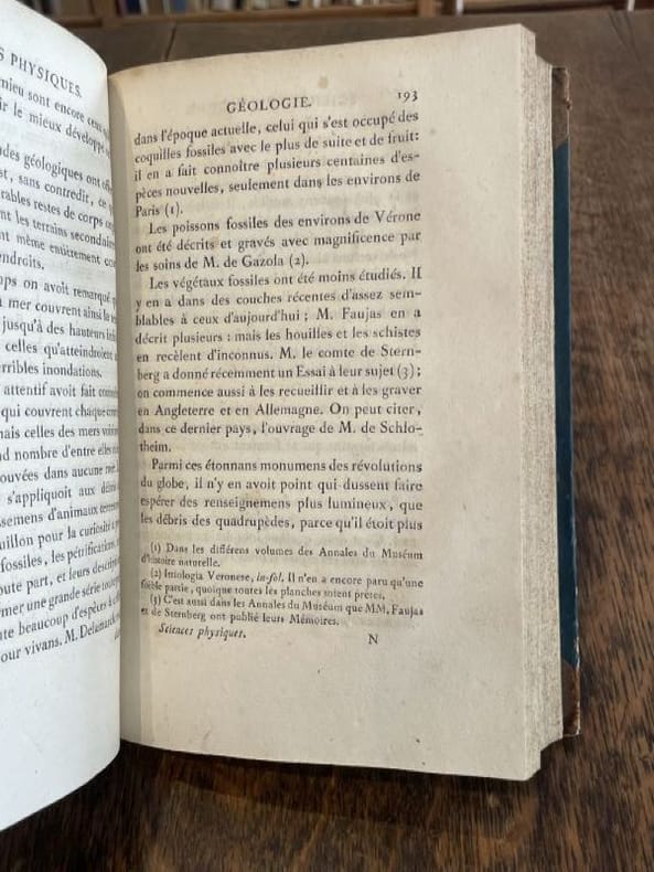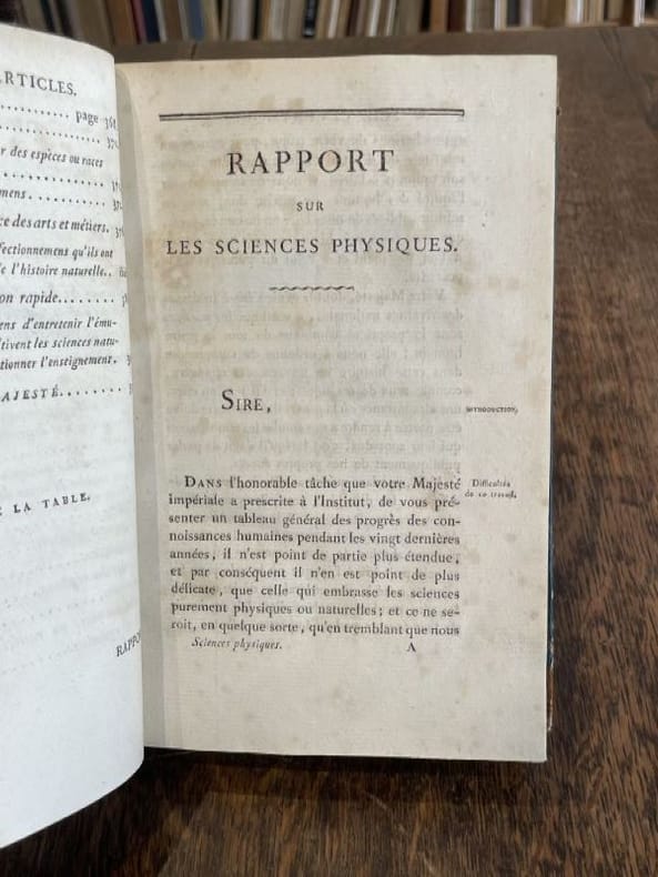 Paris A l'Imprimerie Impériale 1810 1 vol. relié in-8, relié demi-basane tabac à coins, dos lisse orné de fleurons et frises dorés, pièce de titre, tranches mouchetées (reliure de l'époque), XVI + 394 + (2) pp. Edition originale de ce rapport présenté en 1808 sur l'état des connaissances en sciences naturelles : en chimie, météorologie, géologie, biologie, médecine et chirurgie. Tampon d'ex-libris en page de garde. Bonne condition.