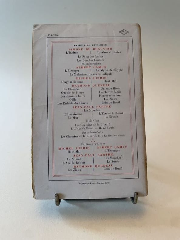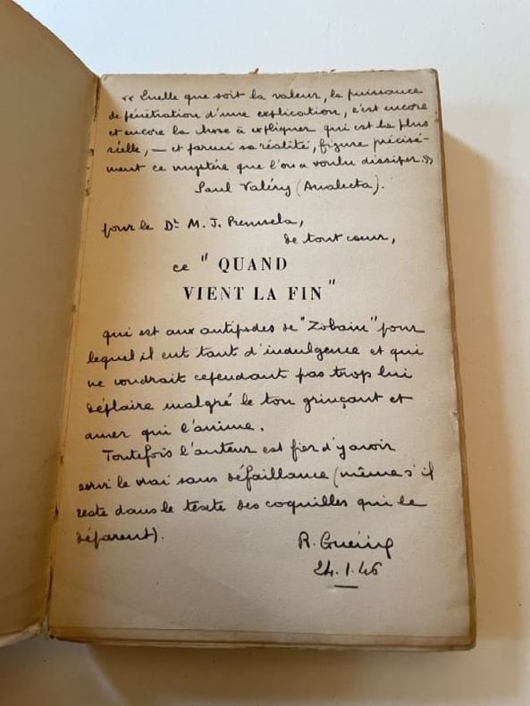 Paris Gallimard 1945 1 vol. Broché in-12, broché, 305 pp. Excellent exemplaire enrichi d'un très bel envoi autographe signé de l'auteur, couvrant toute la page de faux-titre, à un professeur hollandais de littérature française, Martin Jacob Premsela, qui a porté quelques notes de lecture au crayon à papier sur le dernier feuillet du livre. Prière d'insérer et bandeau éditeur joints.