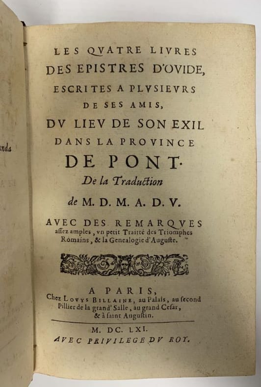 Paris chez Louys Billaine 1661 1 vol. relié in-8, plein veau moucheté tabac de l'époque, dos à nerfs orné de fleurons et roulettes dorés, pièce de titre, tranches mouchetées, (16) pp. + 167 ff. + p. 169-499 + (15) pp., tables et privilège. Edition originale de la traduction et du commentaire de Michel de Marolles (1600-1681). La pagination par feuillet correspond au texte latin présenté avec sa traduction française en regard. Un frontispice parfois mentionné est absent ici. Mors légèrement fendillés en tête, sinon belle condition.