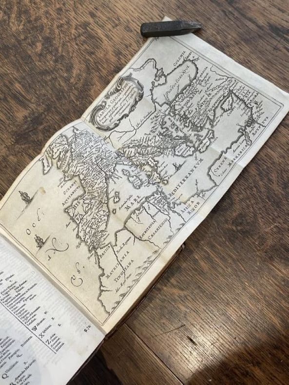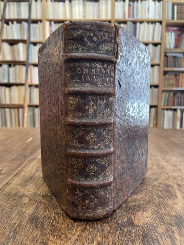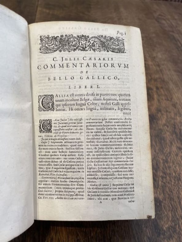 Amsterlodami ex officina Elzeviriana 1661 1 vol. relié fort vol. in-8, plein veau moucheté de l'époque, dos à nerfs orné de fleurons et frises dorées, tranches rouges mouchetées, (14) + 918 + (16) pp., titre gravé, carte dépliante et 4 gravures à pleine page dans le texte, bandeaux et lettrines. Belle édition elzevririenne des oeuvres de Jules César avec les notes et commentaires d'Arnoldus Montanus (1625-1683) et Joseph-Juste Scaliger (1540-1609). Reliure d'origine frottée et un peu usée, sinon l'exemplaire est très frais intérieurement.