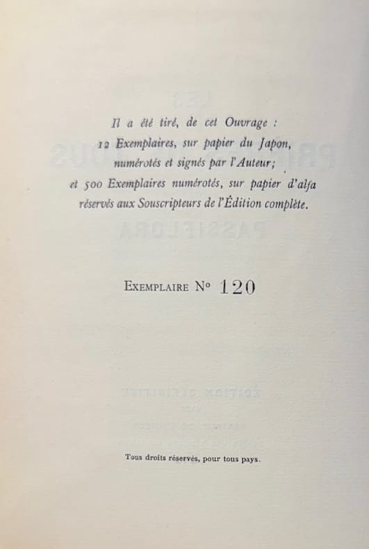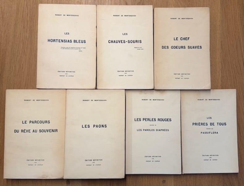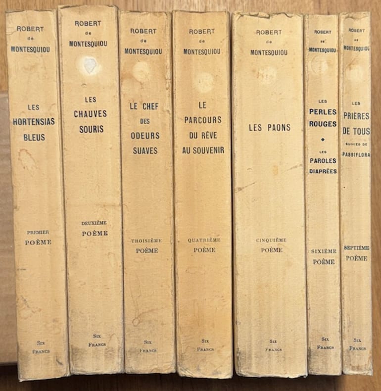 Paris Paris, chez l'auteur, 1906-1912 1906-1912 7 vol. Broché 7 vol. in-8, brochés, couvertures rempliées, portrait-frontispice. Première édition collective de ces oeuvres poétiques, comprenant : Les Hortensias bleus, Les Chauves-souris, Le Chef des odeurs suaves, Le Parcours du rêve au souvenir, Les Paons, Les Perles rouges, Les prières de tous. Chaque volume est l'un des 500 exemplaires numérotés sur alfa. Série complète, en bonne condition malgré des petites décolorations aux dos.
