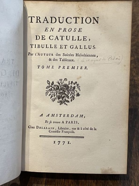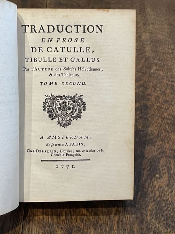 Amsterdam et Paris, Delalain, Amsterdam et Paris, Delalain1771 ; 2 volumes in-12, veau fauve marbré, dos ornés, tranches rouges. (Reliures de l’époque) 2 ff., XXIV pp., 427 pp., 2 pp. - 1 f., 469 pp., 3 pp., 2 ff. de catalogue DelainÉDITION ORIGINALE de cette traduction. Le Marquis Alexandre-Fréderic-Jacques MASSON DE PEZAY, auteur des Soirées Helvétiennes se l’attribue sur le titre. Barbier IV, 733 donne la précision suivante d’après une note trouvée sur l’exemplaire de Desprez de Boissy : “Masson de Pezay, mestre de camp de dragons, mort en 1777 s’est fait l’honneur de cette traduction ; mais elle est de M. DAVID, commissaire ordonnateur des guerres, et premier secrétaire du Prince de Montbarrey”. Cioranesco 43680 maintient Pezay comme traducteur. Mais il signale aussi l’ouvrage au nom de J. B. F. DAVID (de Chalons-sur-Marne) 22333. La Harpe en tous les cas prétendait que Pezay n’entendait pas un mot des auteurs latins qu’il a voulu traduire et que les notes qu’il a jointes à sa version sont curieuses par le ridicule, et écrites du ton d’un sergent de garnison (Corresp. littéraire I, 175). M. Noël, auteur d’une traduction de Catulle l’a jugé moins sévèrement : “Il a pour moi le mérite de m’avoir frayé la route. J’ai tâché d’éviter les écueils qu’il m’a paru n’avoir évités et de faire mieux que lui, en lui empruntant tout ce qu’il a fait de bien”.Dans le discours préliminaire, le traducteur dédie son travail “à toutes les femmes. J’en exepte seulement celles qui iront comparer la version avec le texte. Je n’aime pas les dames qui savent le latin, et ne courerai jamais risque de perdre le mien avec elles.” Les pièces “scabreuses” de Catulle, en particulier celles qui concernent les amours masculines, n’ont pas été traduites. Elles sont regroupées (pas toutes d’ailleurs ! les plus explicites manquent) dans un chapitre à part (pages 261-291) sous le titre Carmina nimium obscoena obscura aut inelegantia. Même précaution pour les vers ad Priapum de Tibulle. Schweiger I, p. 88 (qui donne la note de Barbier).