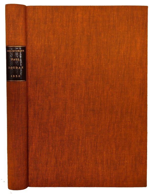 Paris Georges Andrieux 1930 1 vol. relié in-4, bradel de toile orange, dos lisse avec pièce de titre de maroquin marron, tête dorée, non rogné, couvertures et dos conservés,148 pp. Catalogue de la bibliothèque du grand critique littéraire Paul Souday (1869-1929), présentant 800 lots d'éditions originales dédicacées et de correspondances autographes d'auteurs contemporains. Avec un intéressant avant-propos et un "avis important" de l'expert qui souligne la nouveauté d'une telle vente de "services de presse", dédicacés, coupés, annotés... Exemplaire de luxe imprimé sur vélin d'Arches, complet des 21 planches de reproductions in fine et enrichi d'un portrait photographique sur papier glacé par Manuel. On joint un long article de presse d'Émile Henriot sur cette célèbre vente (Le Temps, 11 mars 1930). En superbe condition.