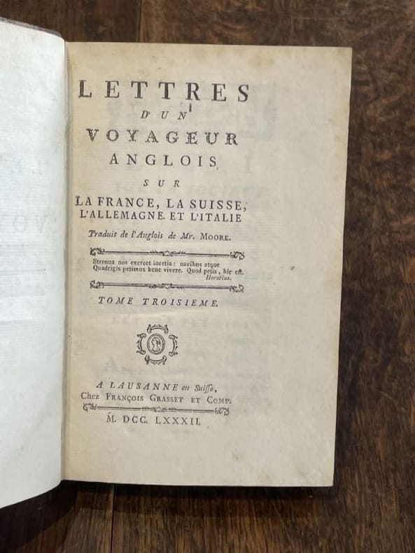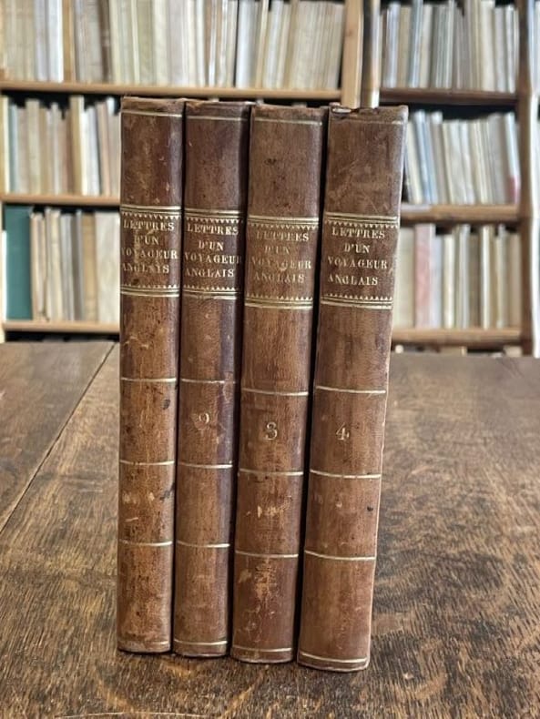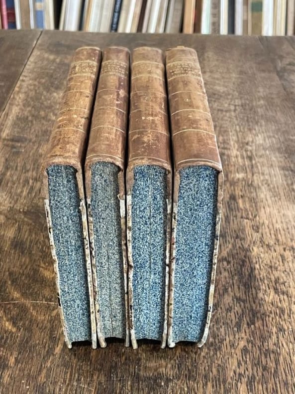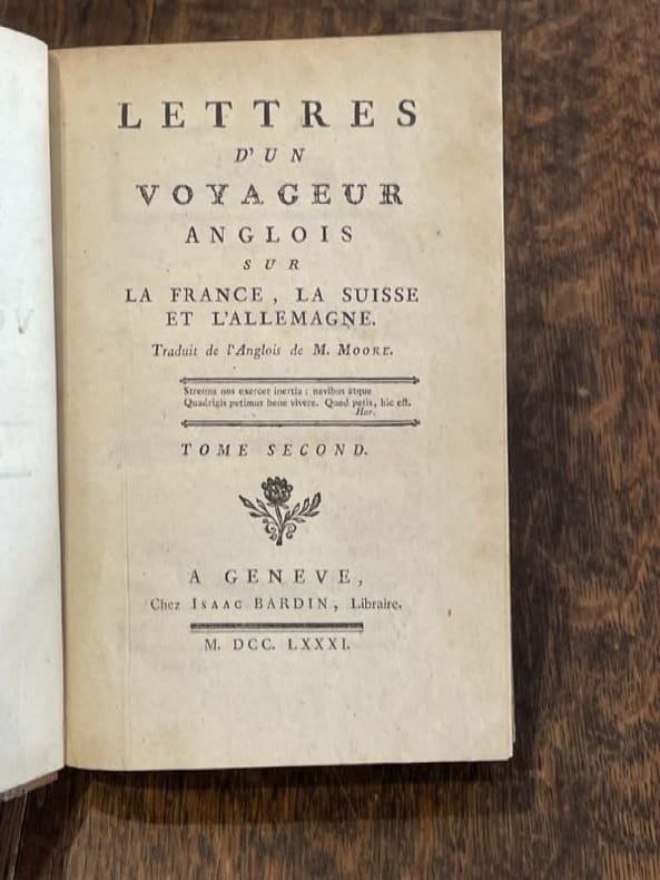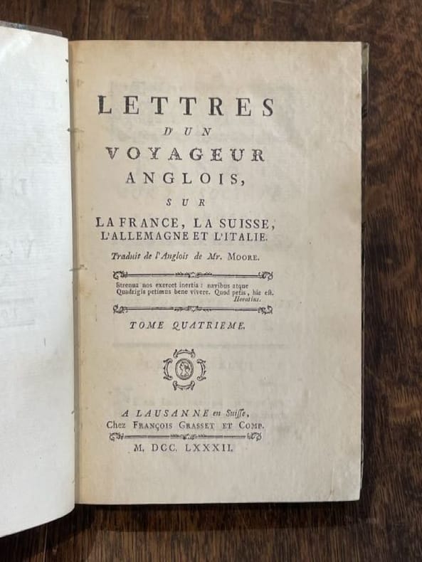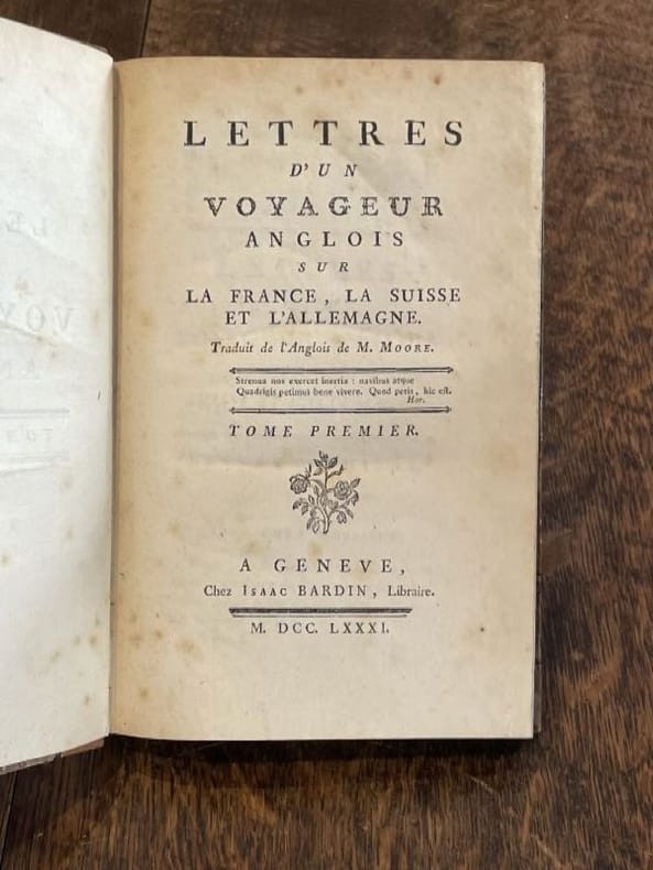Genève et Lausanne Bardin & Grasset 1781-1782 4 vol. relié 4 vol. in-8, demi-basane fauve, dos lisses ornés de filets dorés, tranches mouchetées (reliure fin XIXe), 362, 362, 423 et 422 pp. Traduit de l'anglais par M. Moore. Agréable reliure avec les dos patinés.