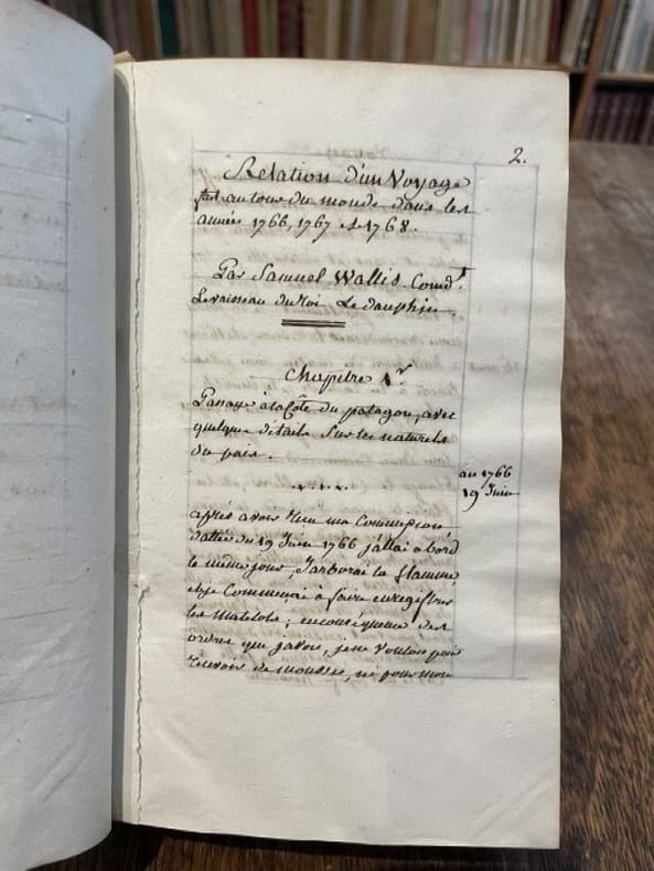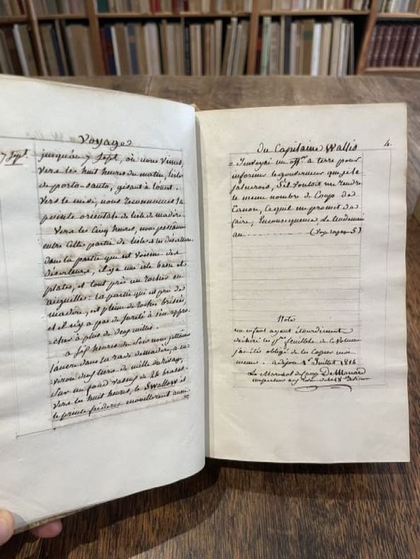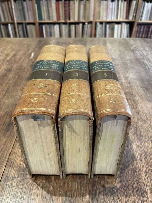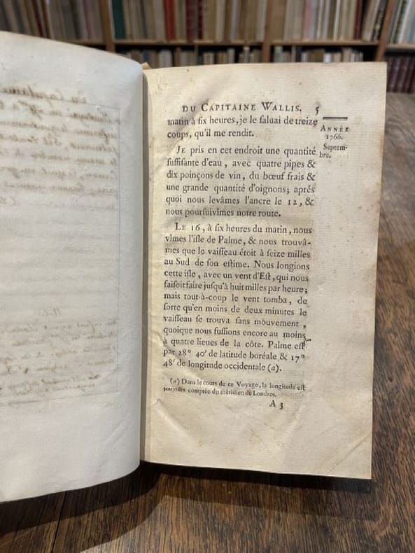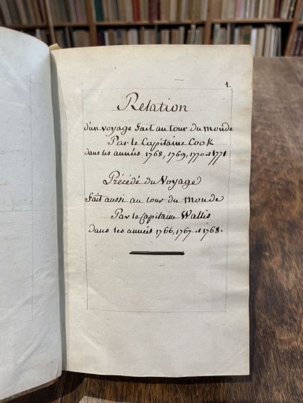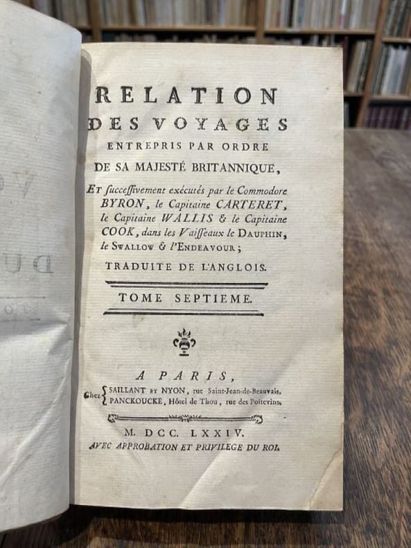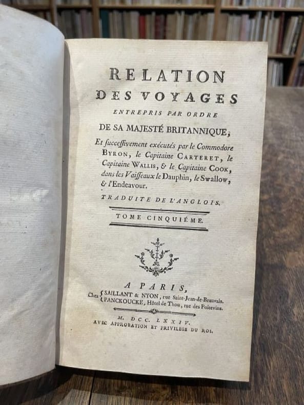 Saillant et Nyon, Panckoucke 1774 3 vol. relié 6 tomes reliés en 3 vol. in-8, demi-basane fauve mouchetée, dos lisses, pièces de titre et de tomaison de basane miel, verte et havane, filets et fleurons dorés, tranches jaunes (reliure du XIXe), 445, 462, 374, 312, 356 et 336 pp. Cet exemplaire concerne les tomes 3 à 8 de la "Relation des voyages" qui correspondent au texte intégral de la "Relation d'un voyage fait autour du monde par le Capitaine Cook dans les années 1768, 1769, 1770 et 1771". Précédé du "Voyage fait aussi autour du monde par le Capitaine Wallis dans les années 1766, 1767 et 1768". Notre exemplaire a un supplément d'âme : une page de titre et 5 pages soigneusement manuscrites à l'encre noire avec cette note au bas de la dernière page : "Un enfant ayant étourdiment déchiré les premiers feuillets de ce volume, j'ai été obligé de les copier moi-même (1er juillet 1811)". Bien établi en trois volumes agréablement reliés.
