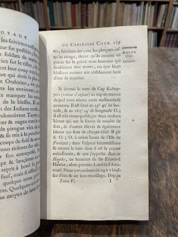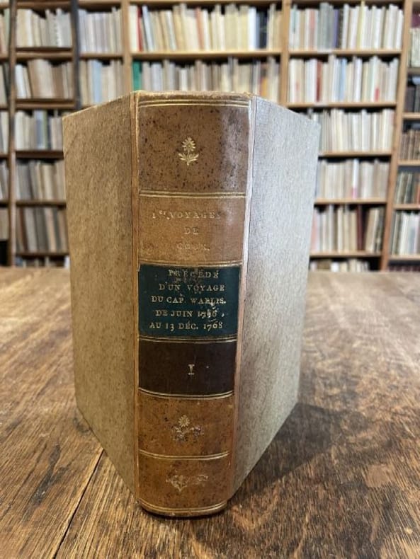 21 In-8° pour le texte et in-4° pour les atlas. Demi-veau havane. Dos lisse souligné par des paires de filets dorés. Auteur, titre, tomaison et n° du voyage dorés. Plats décorés de papier marbré. Frottements timides çà et là. Coins légèrement émoussés. Intérieur très frais. Tampon encré aux initiales d'un ancien propriétaire à la 1ère garde du tome I du 1er voyage : M de J. Édition des trois voyages du capitaine Cook, dans une reliure homogène vers 1820. Les trois volumes d'atlas (un par voyage) avec les planches au format in-4° s'ajoutent à cet exemplaire, ce qui est loin d'être toujours le cas. Complet de toutes les cartes et planches à savoir : Atlas 1er voyage : 50 planches Atlas 2e voyage : 66 planches Atlas 3e voyage : 87 (portrait-frontispice de Cook compris ; erreur de numérotation : 2x la n°52) + 1 planche non numérotée relatant la mort de James Cook Soit au total 204 planches. Beaux tirages (marges parfois courtes pour les voyages 1 et 2). Paris, Nyon et Mérigot, 1789, 8 volumes ; Paris, Mérigot, 1792, 6 volumes ; Paris, Raymond, 1819, 4 volumes ; + 3 volumes d'atlas in-4° (l'atlas consacré au 1er voyage daté 1774 (année de la 1ère édition) et l'atlas consacré au 3e voyage imprimé à Paris, Hôtel de Thou, 1785). Soit 21 volumes au total.