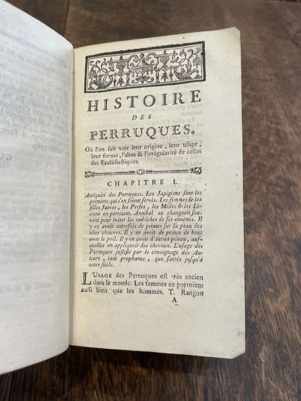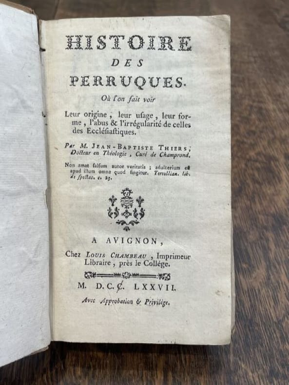 Histoire des perruques où l'on fait voir leur origine, leur usage, leur forme, l'abus et l'irrégularité de celles des ecclésiastiques. (Avignon: Louis Chambeau, 1777) [M.C.: histoire, religion, costume, coiffure, perruques]