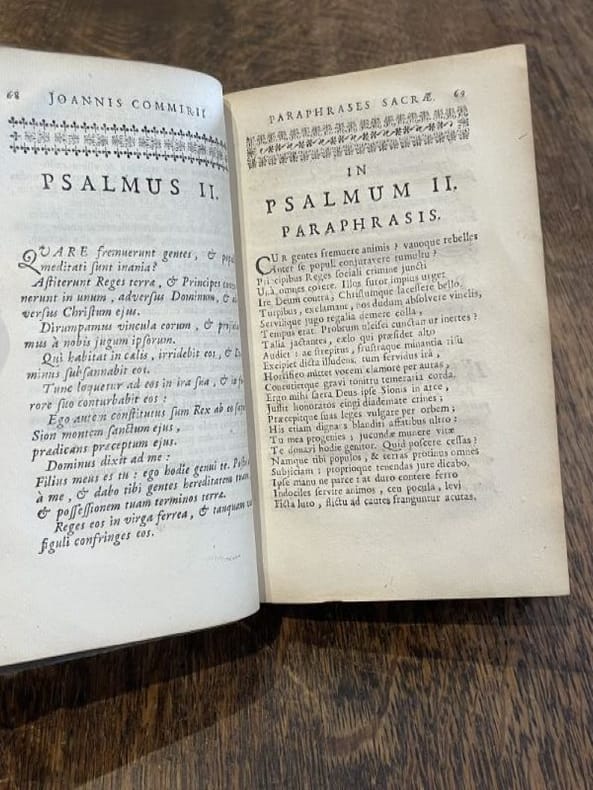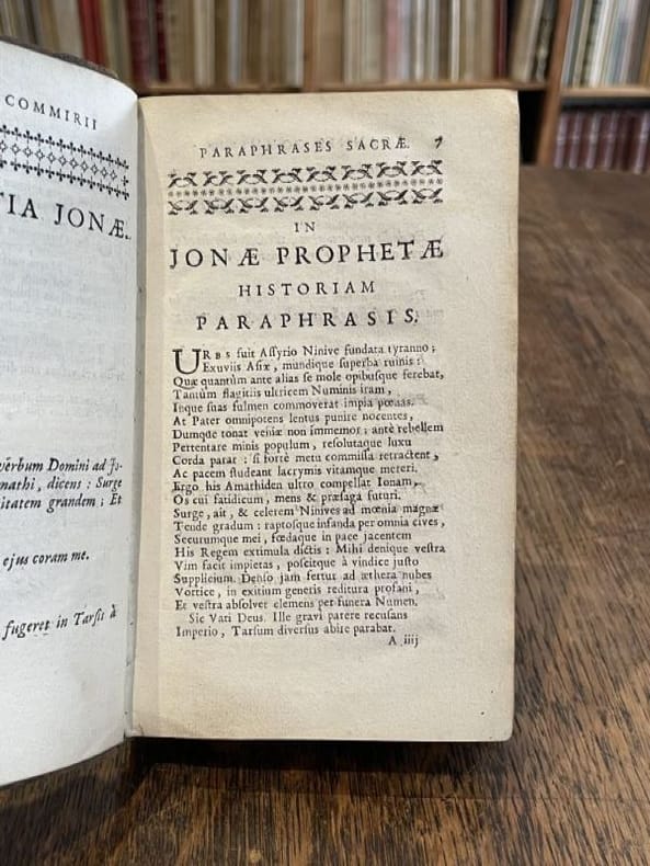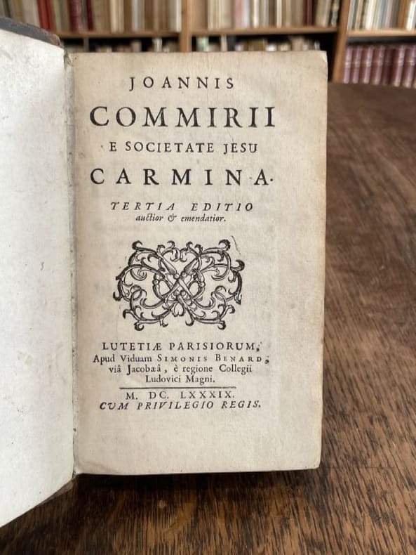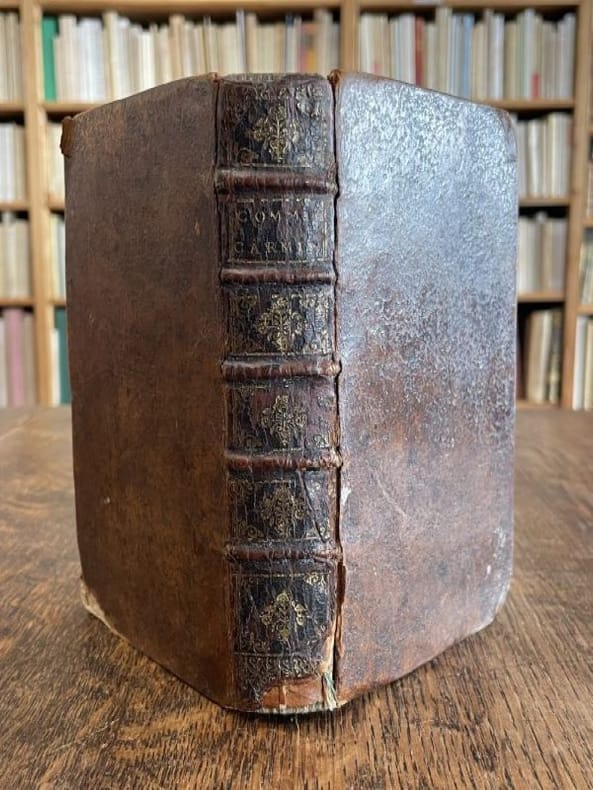 Lutetiae Parisiorum Apud Ciduam Simonis Benard 1689 1 vol. relié in-12, relié plein veau moucheté tabac, dos à nerfs orné de fleurons dorés, tranches mouchetées (reliure de l'époque), 463 + (1) pp. (manque de cuir à la coiffe inférieure, mors supérieur fendillé, coins émoussés, infimes galeries de vers sans gravité en fin de volume). Troisième édition augmentée de ce recueil de poésies latines de Jean Commire (1625-1702), réunissant odes, fables, paraphrases sacrées et divers miscellanées. Il s'agit du recueil le plus complet de ce jésuite et poète néo-latin, qui sera plusieurs fois réédité par Barbou au XVIIIe siècle.